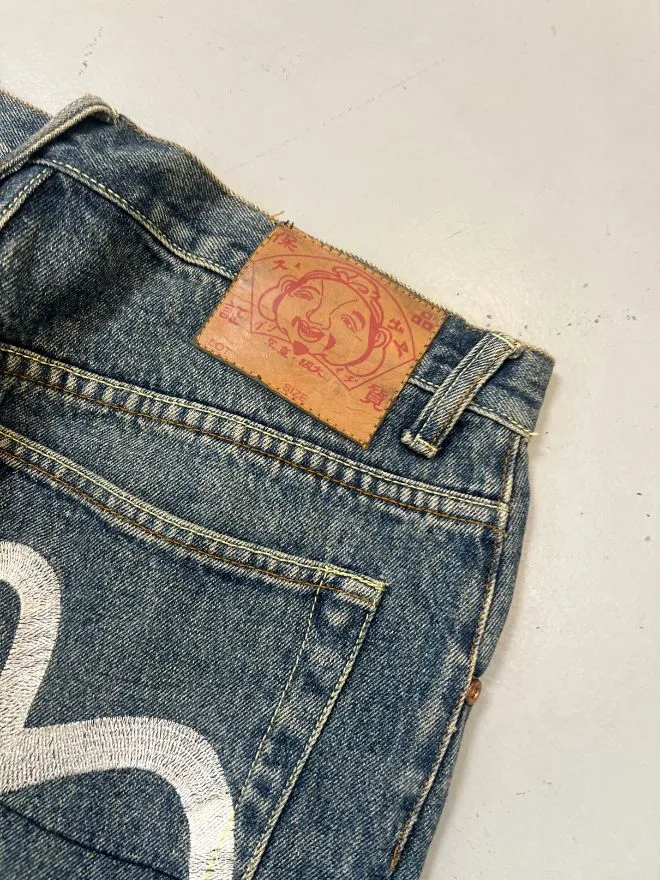 Authentic vintage Japanese brand denim inspired by Evisu styling. Classic blue denim with a comfortable fit. Size 32. Well maintained condition.