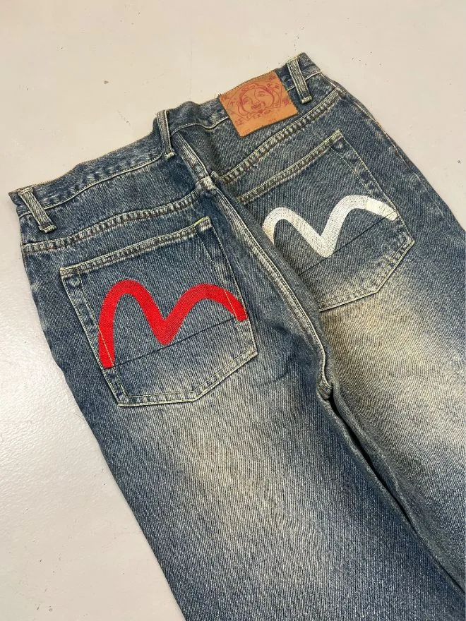 These vintage Japanese brand denim jeans are inspired by classic Evisu designs, known for their bold streetwear and premium denim heritage. Crafted with quality materials and strong construction, this pair offers both durability and timeless style.