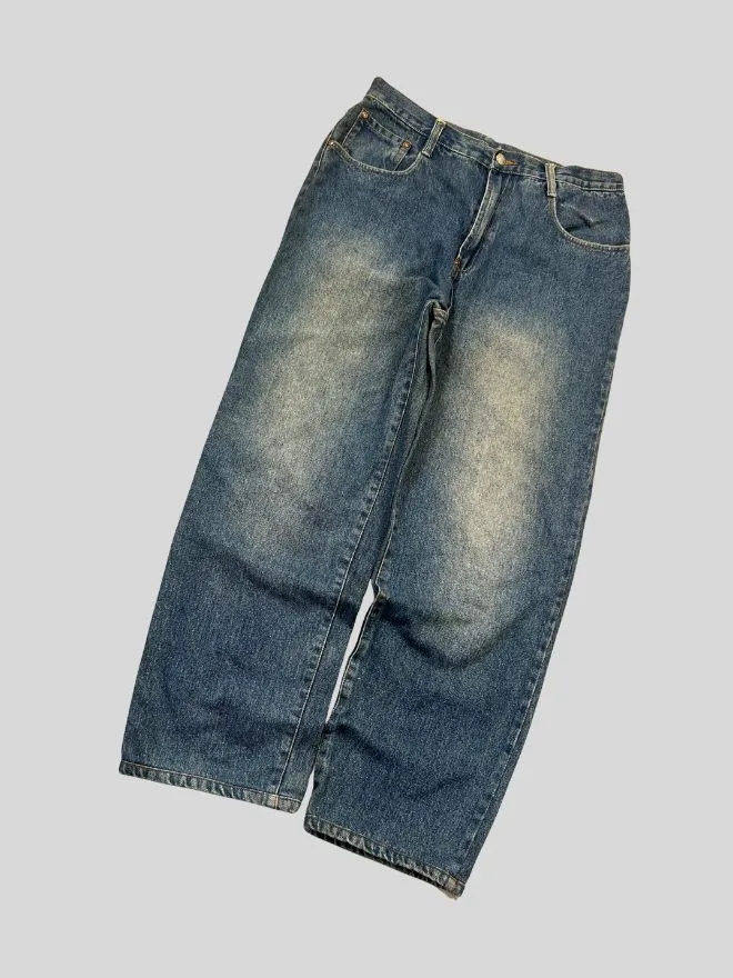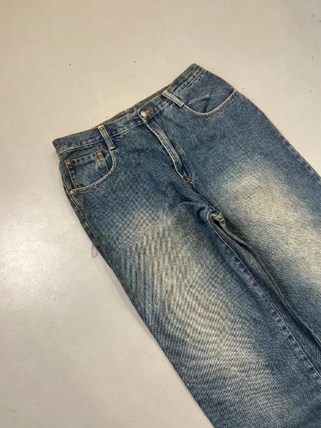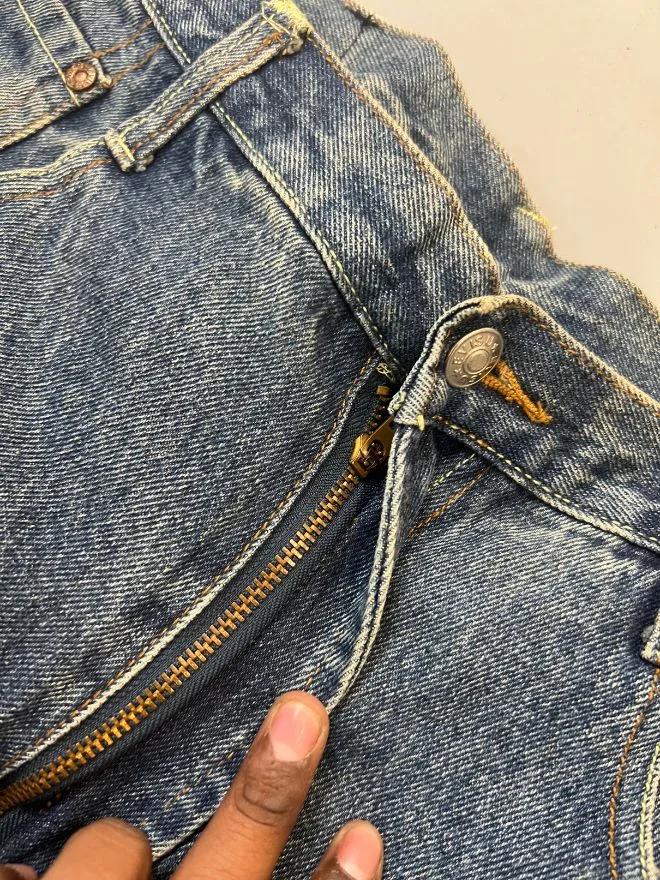 Made from sturdy blue denim, these jeans feature a clean and versatile look that works well with casual, streetwear, and vintage-inspired outfits. The fabric shows natural texture and character, reflecting its authentic vintage appeal.