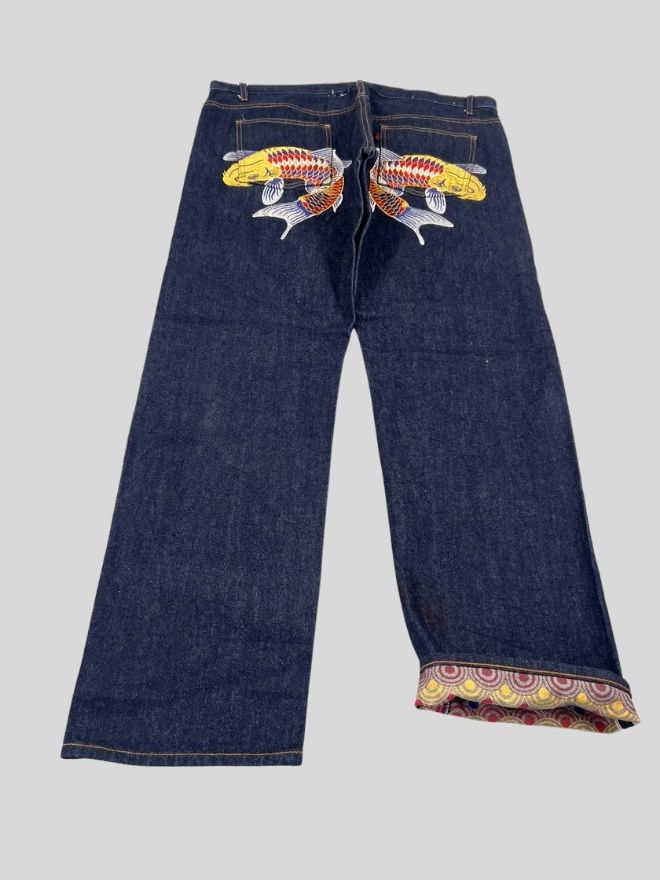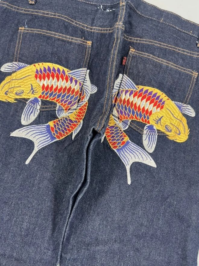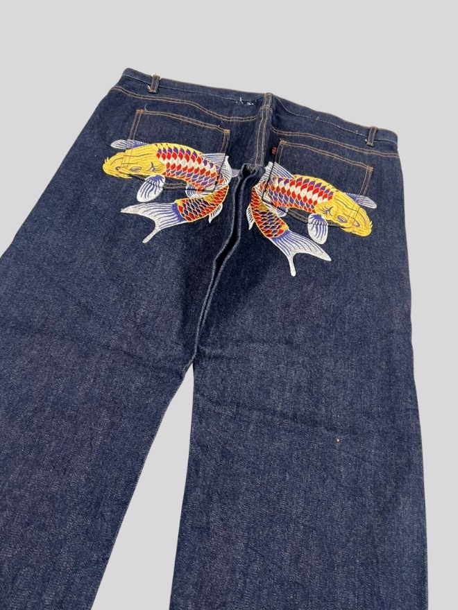 Unique vintage Japanese brand selvedge denim featuring detailed fish embroidery with an avant-garde aesthetic.