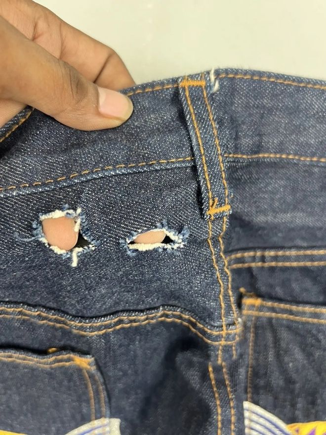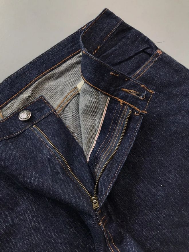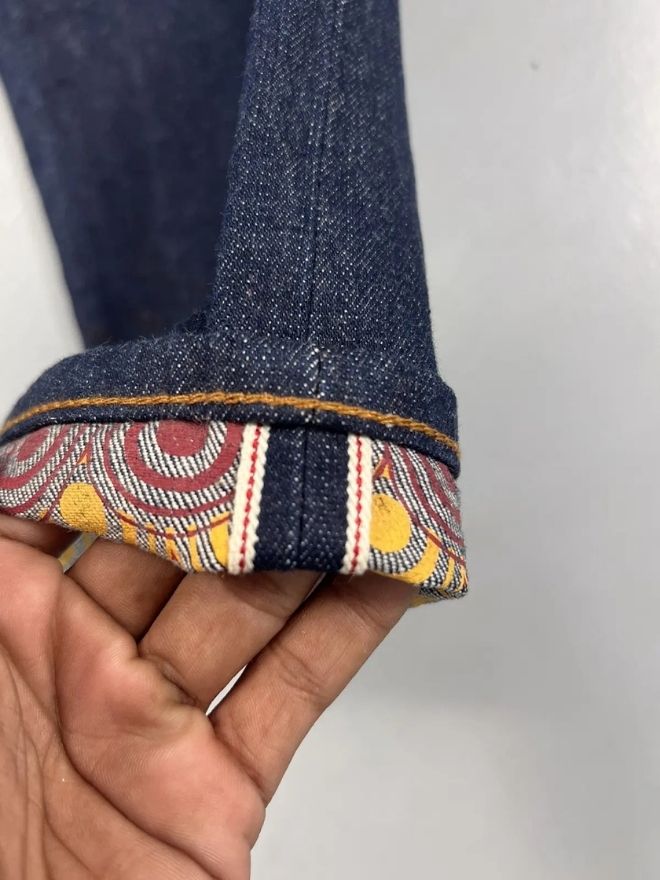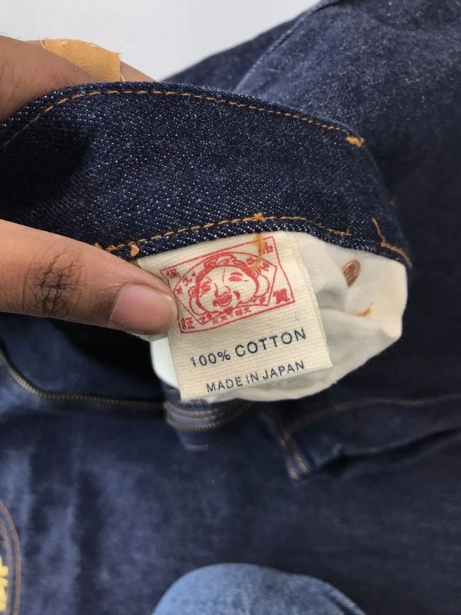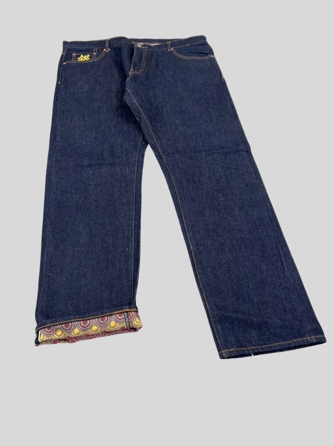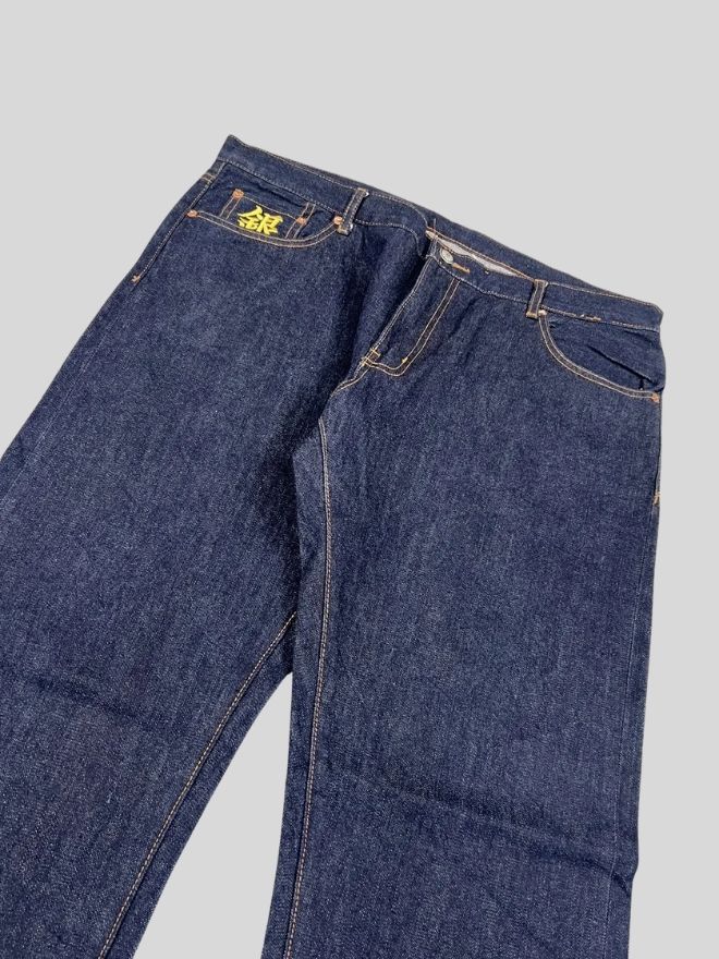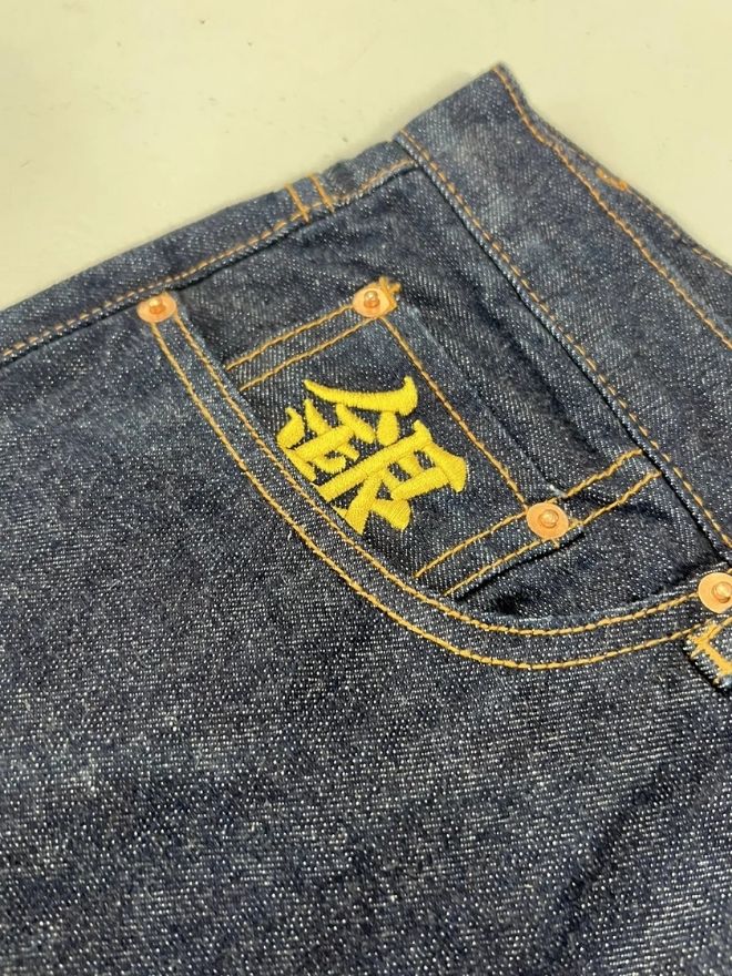Constructed from sturdy selvedge denim, this pair reflects durability, character, and authentic vintage appeal. The relaxed silhouette and strong visual embroidery make it suitable for statement streetwear fits or curated archive collections. A rare find for anyone looking to add distinctive Japanese denim to their wardrobe.