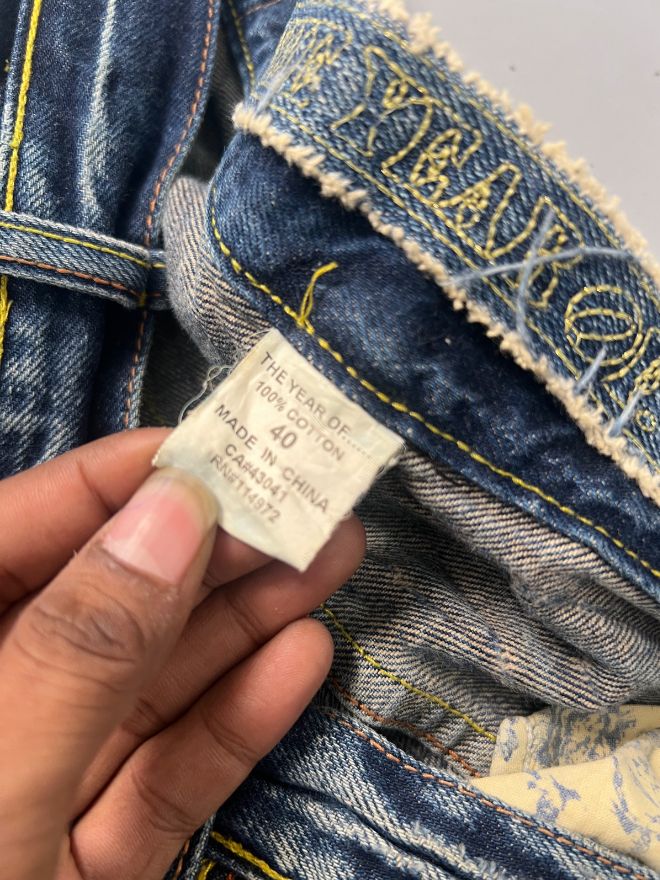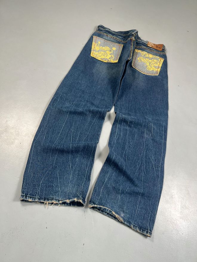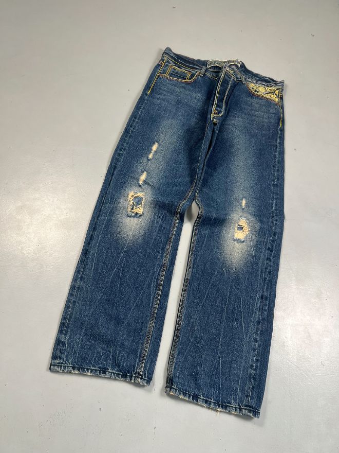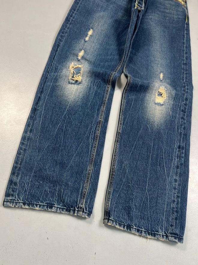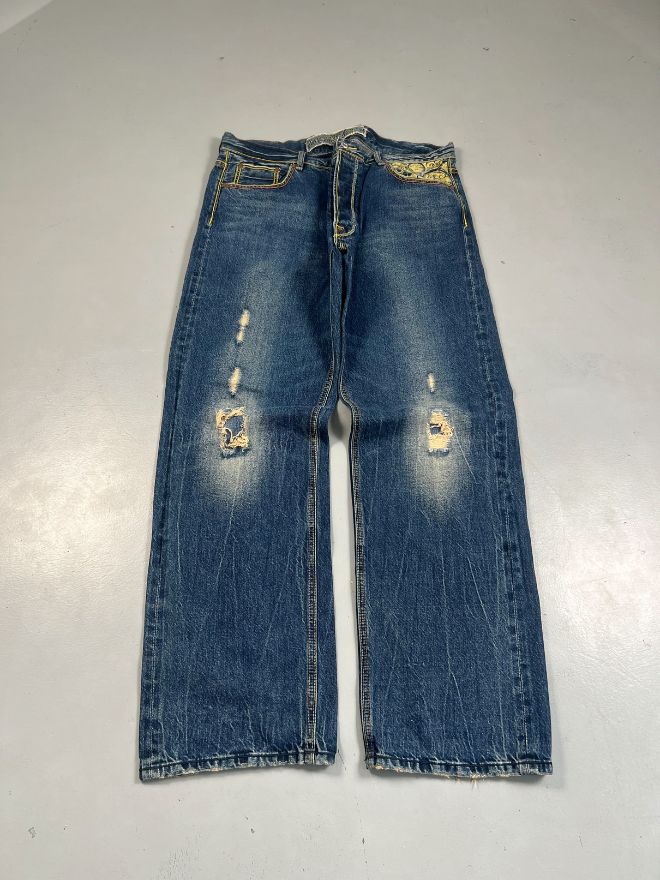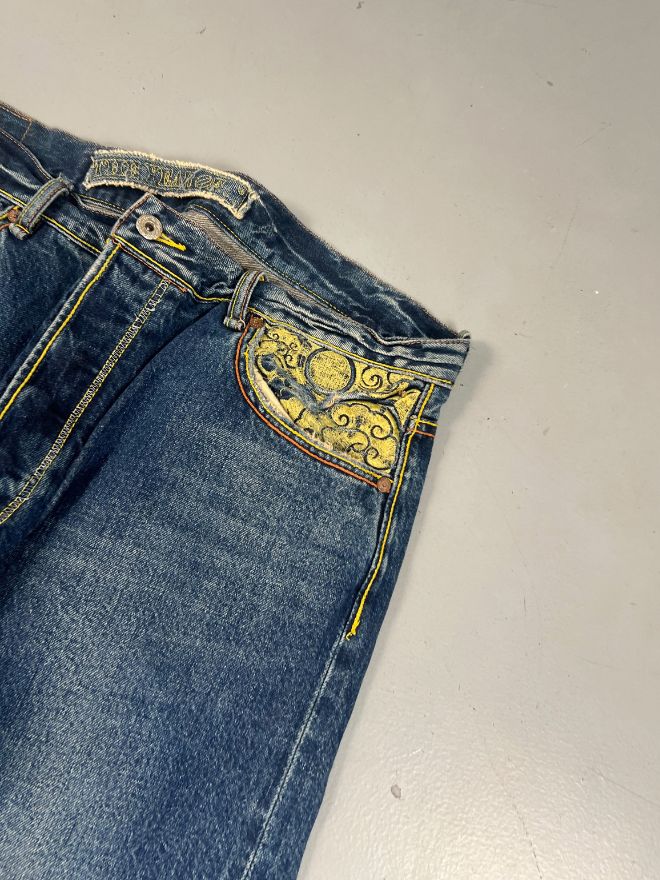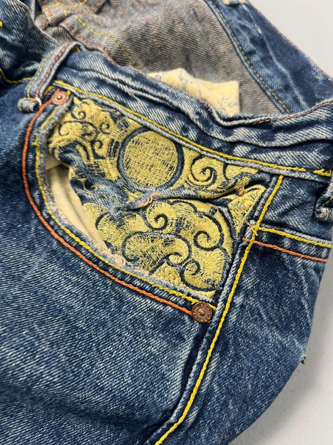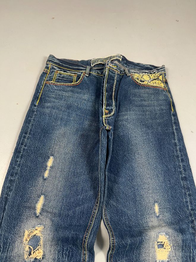 The denim comes in a classic blue wash with striking golden embroidery on the legs. Condition is exactly as shown in the photos—please review all images carefully to understand the garment’s authentic vintage character.