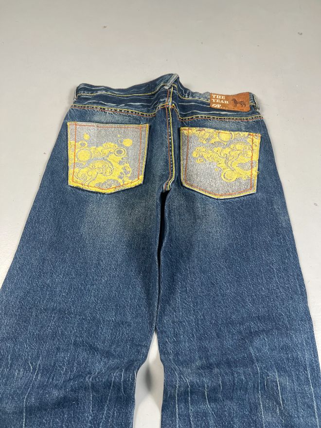 Step into unique Japanese craftsmanship with these Vintage ‘Year of the Golden’ Embroidered Denim Pants. This piece features bold, intricate embroidery that highlights traditional Japanese art themes, making it a standout item for collectors and fashion enthusiasts.