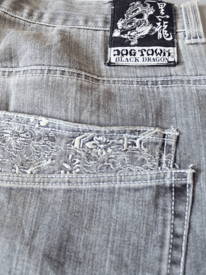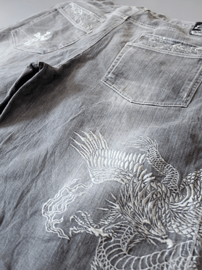 The true centerpiece of these jorts is the intricate embroidered dragon design. Likely located on the back pocket or a prominent leg panel, this fiery creature adds a touch of mythical flair. It also lets your unique personality shine through.