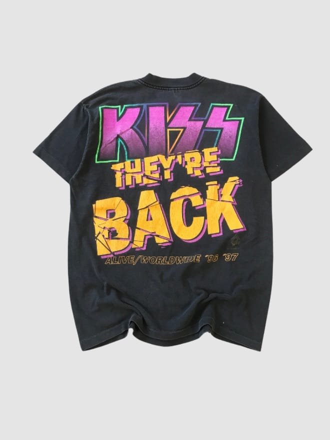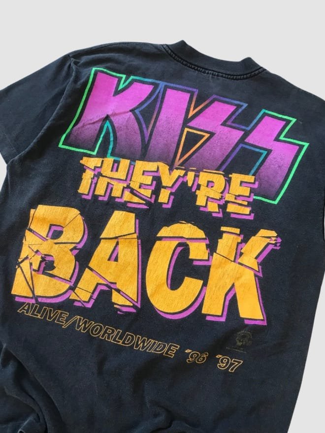 “This is a genuine vintage KISS tee, featuring the iconic ‘They Are Back’ graphic, a symbol of their legendary return.”