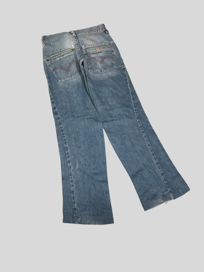 The jeans are in perfectly fine and comfortable used condition. There are some dusty stains, which can be removed with a hard wash or dry cleaning. No major flaws observed. Please review all photos carefully to understand the exact condition before purchasing.