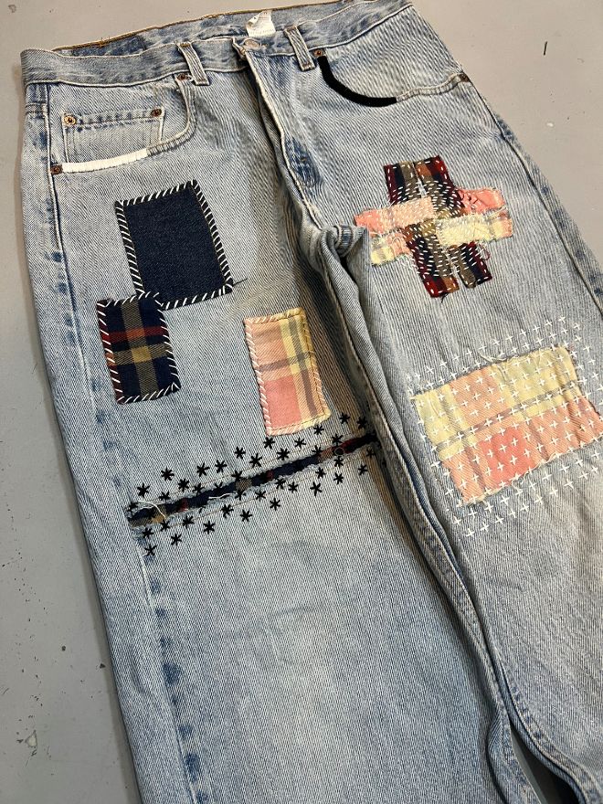 The denim comes in a blue vintage wash with shashiko-style detailing that adds character and texture to the jeans. The relaxed cut provides ease of movement, making them ideal for daily wear, layering with boots or sneakers, and pairing with classic vintage tops.