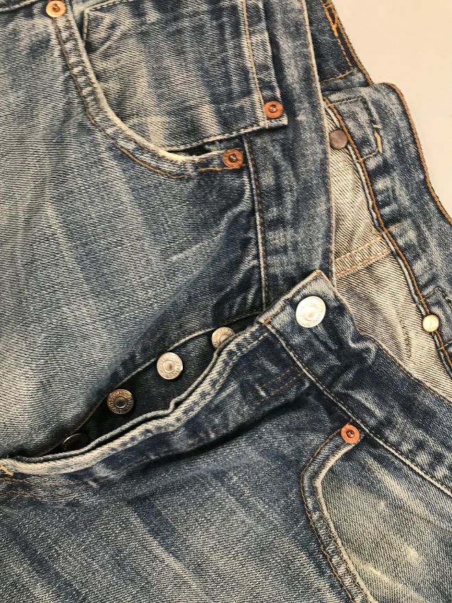 • Features: Buckle-back detail, classic straight-leg shape, vintage fade, early workwear construction