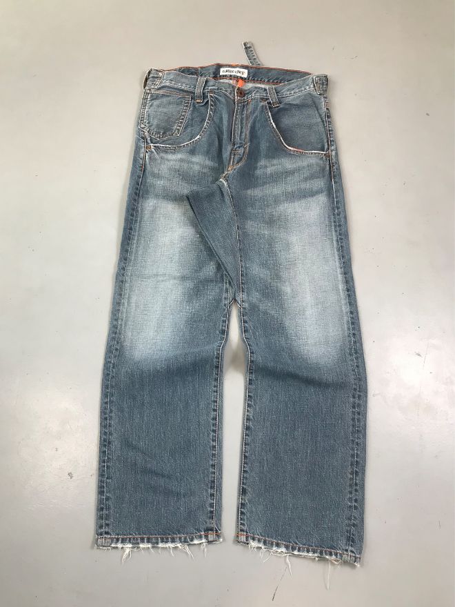 Vintage Levi’s buckle belt denim in a dusty blue wash. Tagged size 35 with full measurements below. Features repaired damage—please review photos carefully.