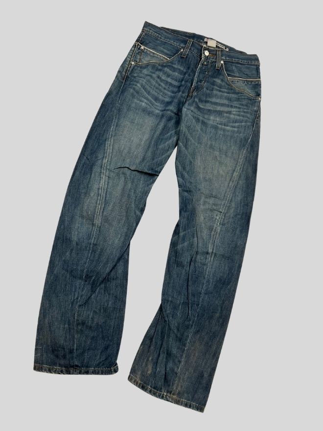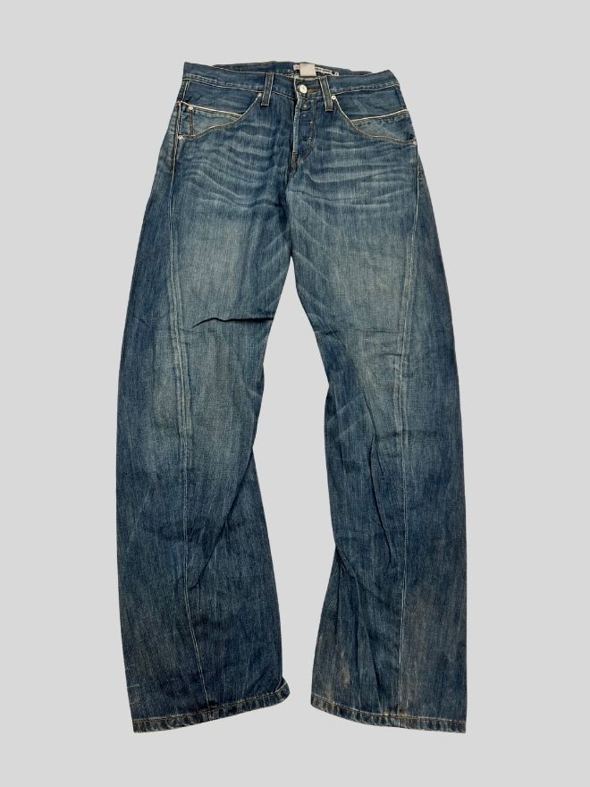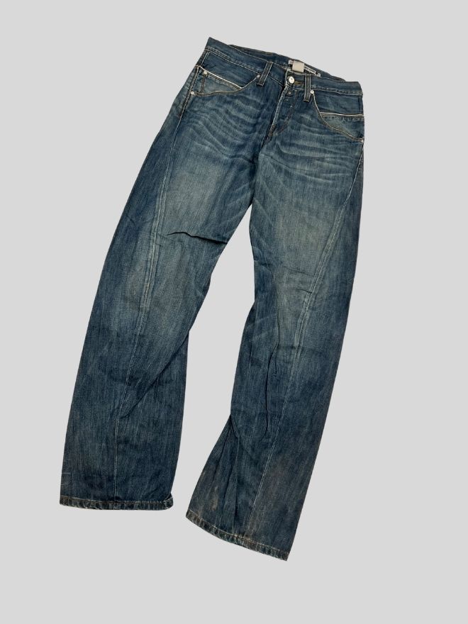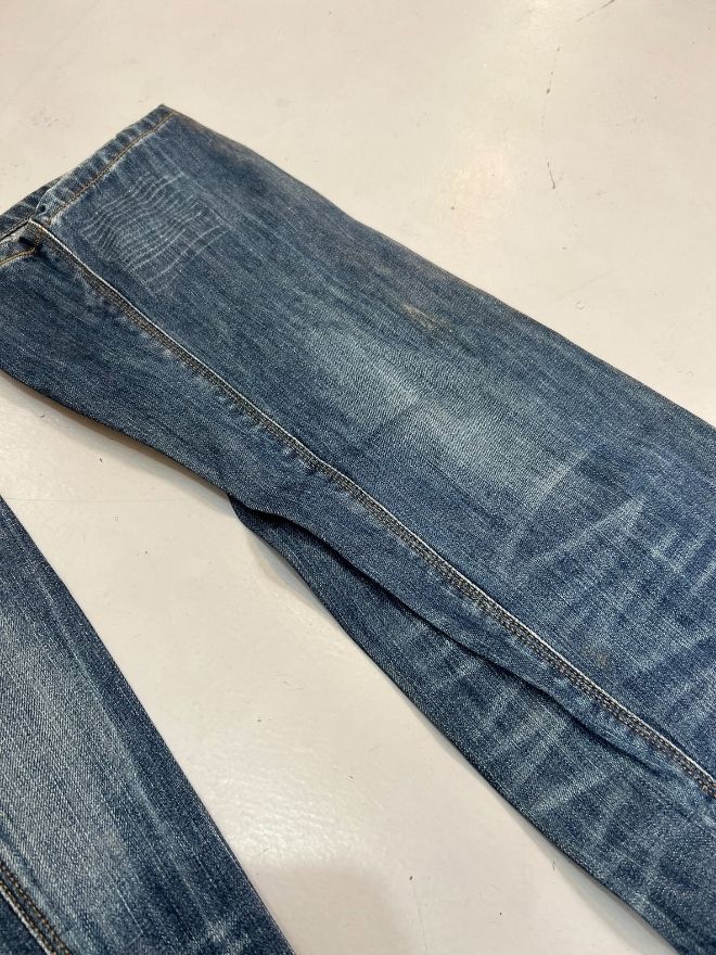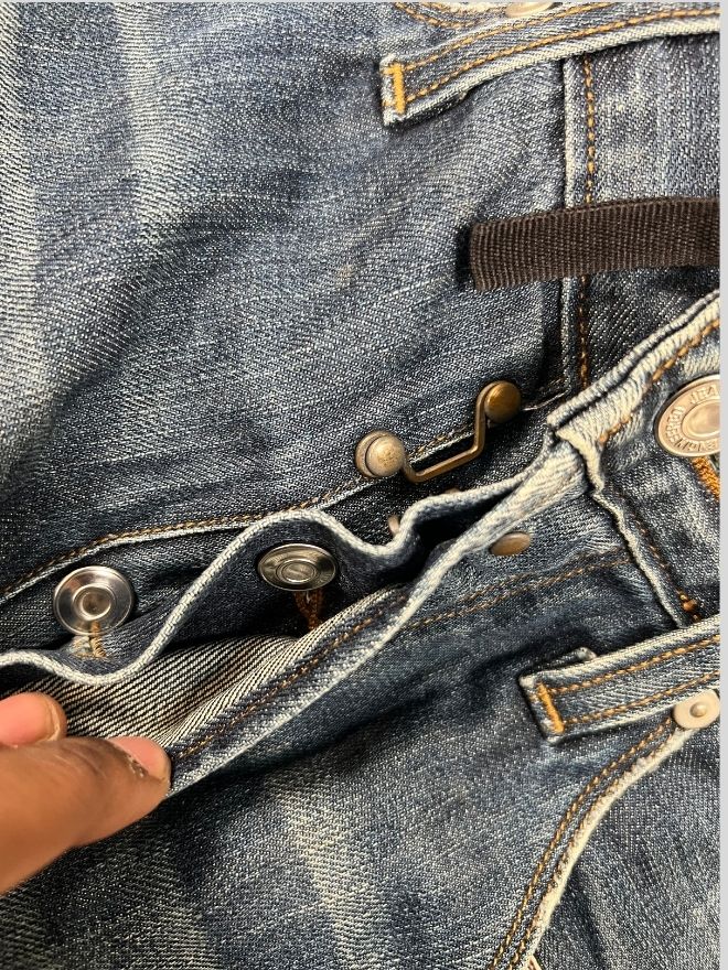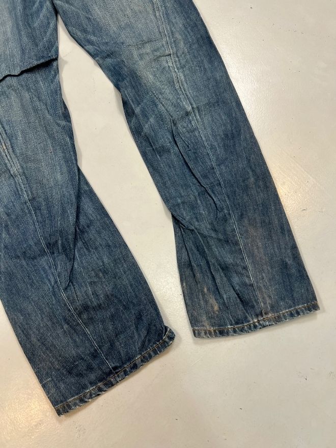These jeans are pre-owned and show visible distressing and minor damages, adding to their rugged vintage character. They remain wearable and structurally solid, but please refer to photos to understand condition before purchase.
