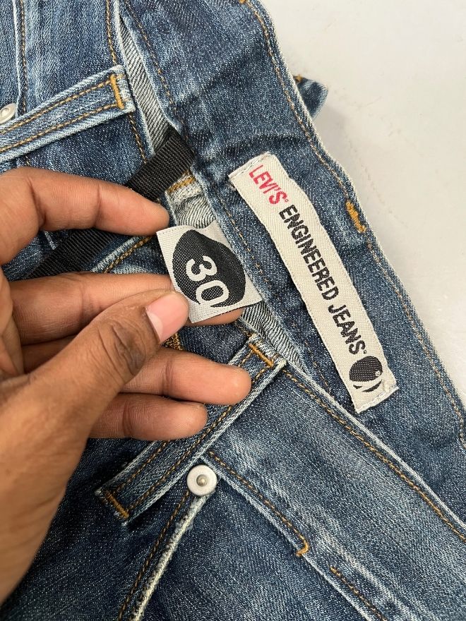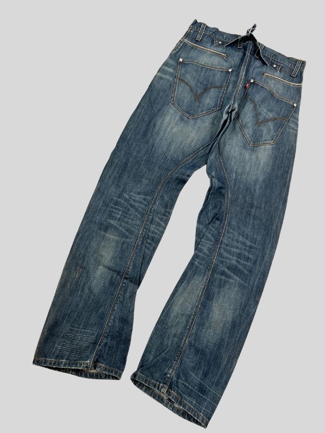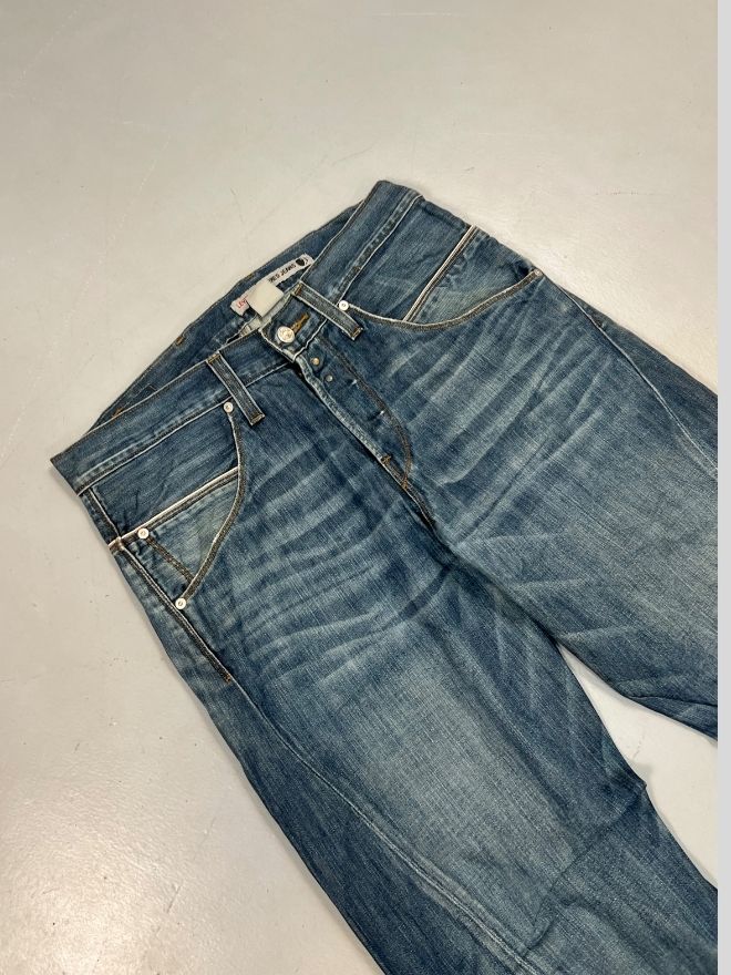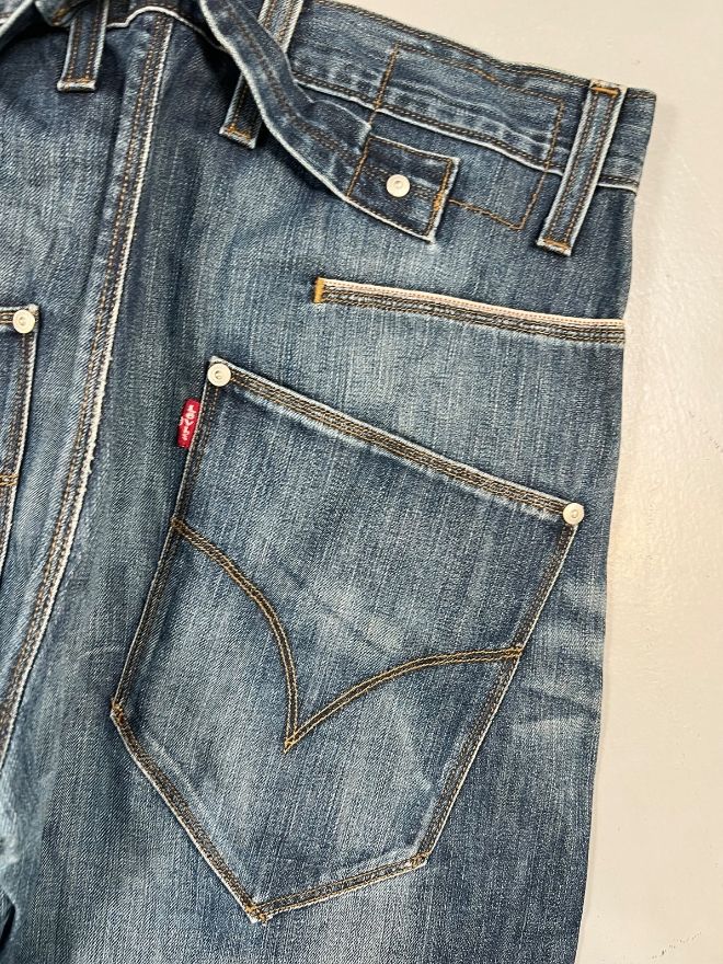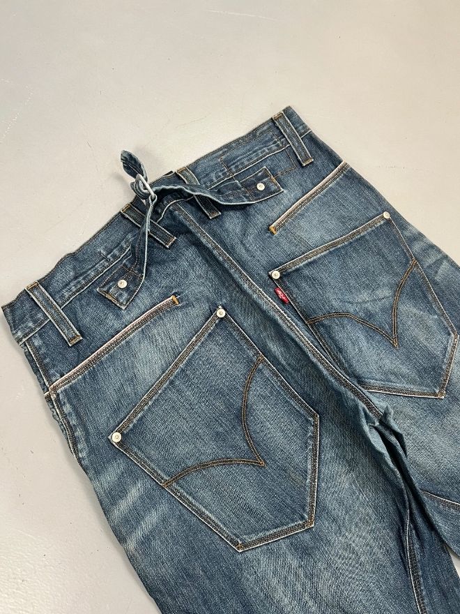 Vintage Levi’s engineer buckle-belt denim with a unique utilitarian fit and signature adjustable belt closure. Tagged Size 32 with a washed blue tone and worn-in workwear character.