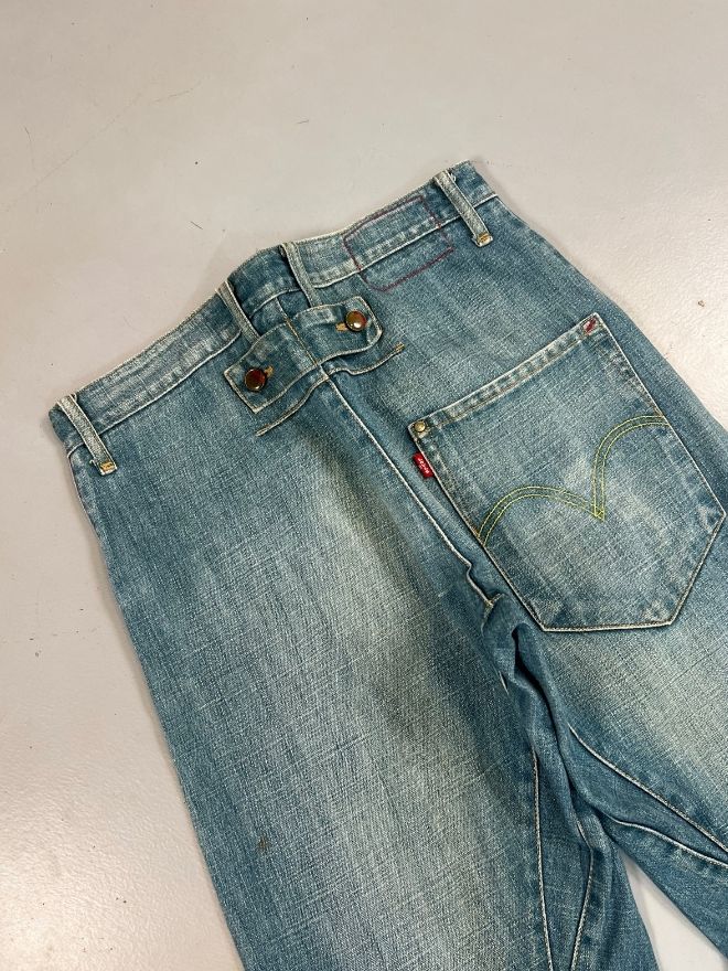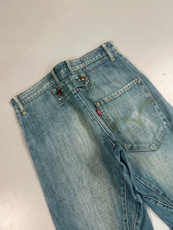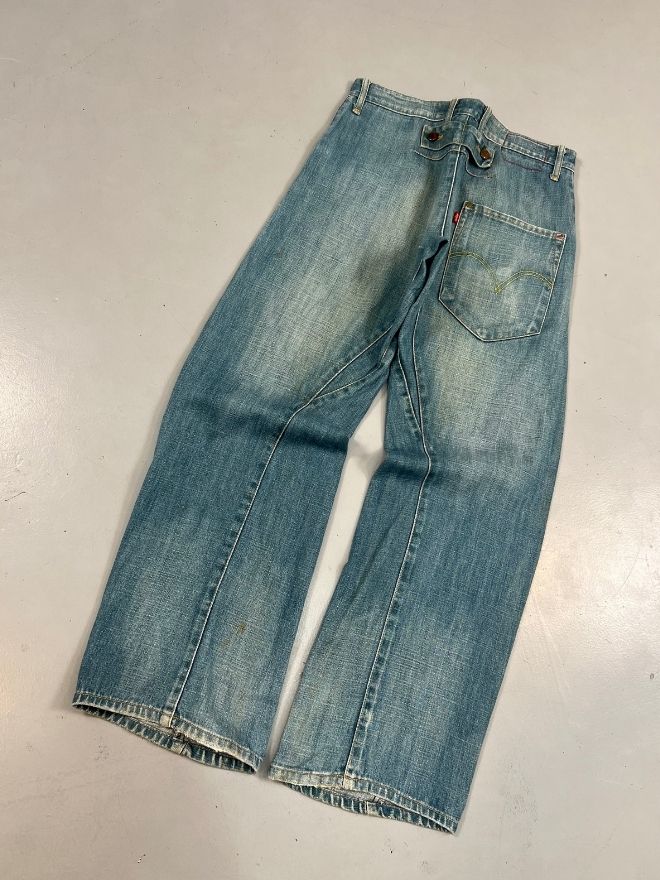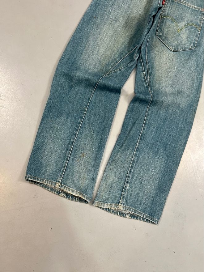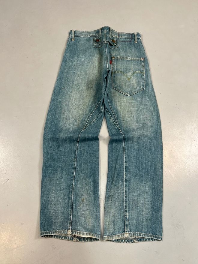 The fit offers a relaxed straight structure with a mid-rise, making it wearable with boots, sneakers, or heavy-duty workwear silhouettes. If you’re building an archival wardrobe or love unique Levi’s era-specific construction, this piece is a strong addition.