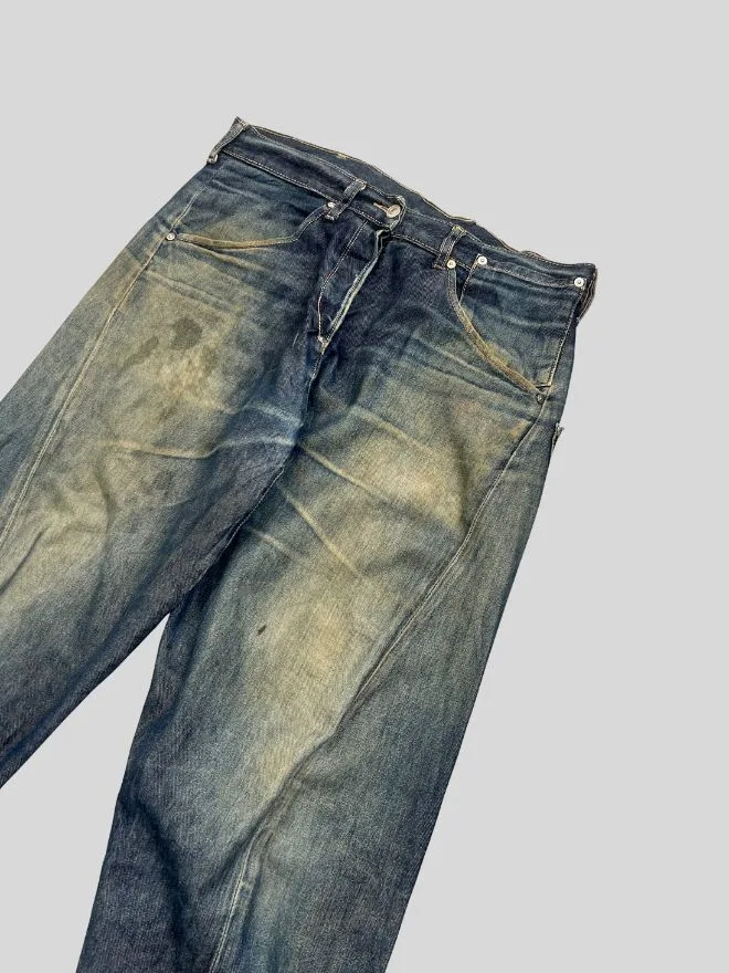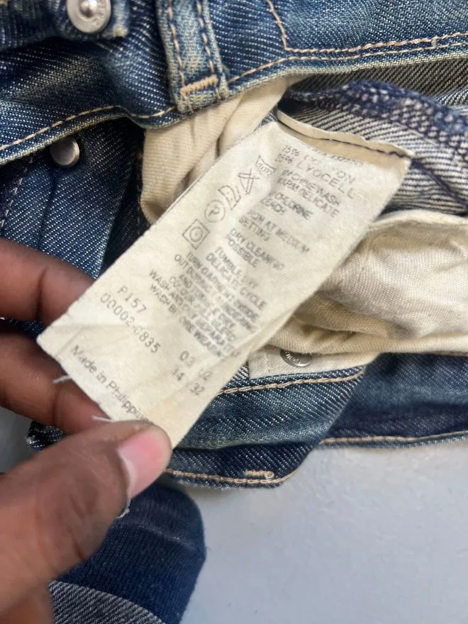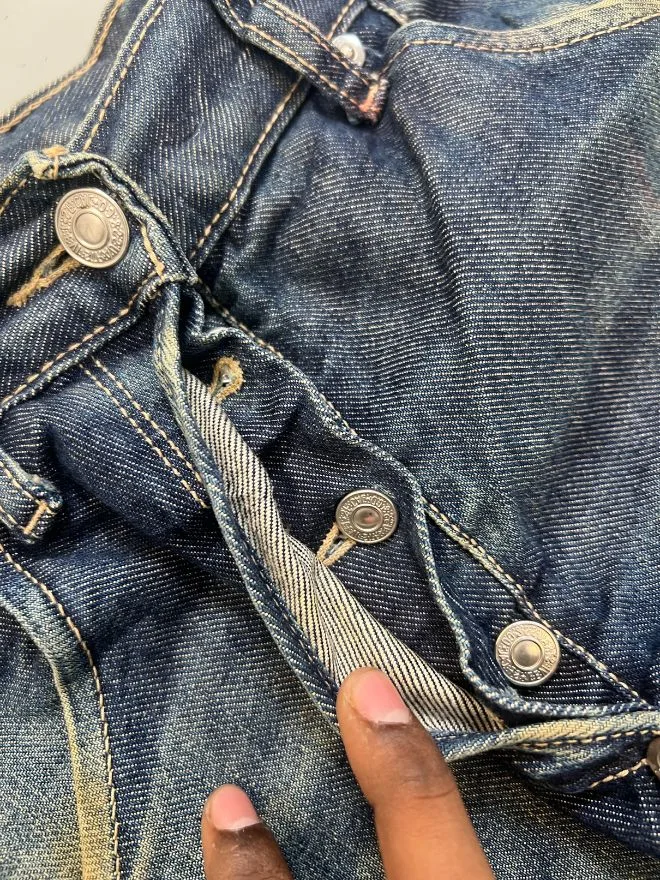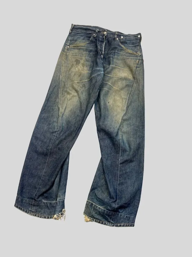 This pair is in used condition and has visible damages, as shown in the pictures. Buyers are advised to carefully review all photos before purchasing. These imperfections are part of the garment’s vintage nature and do not take away from its authenticity.