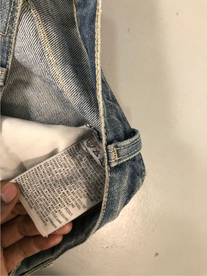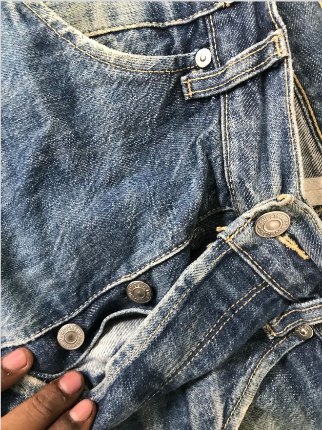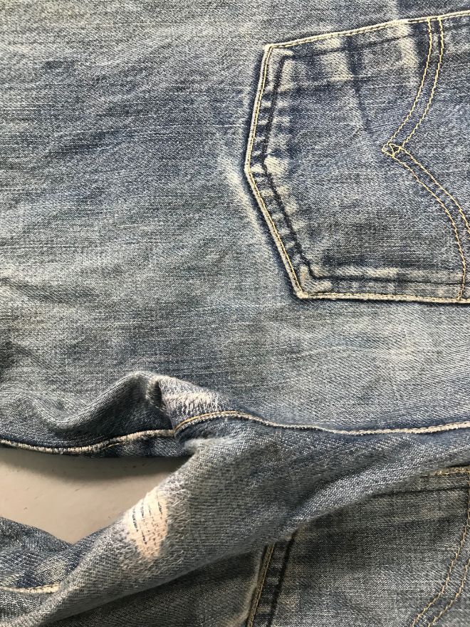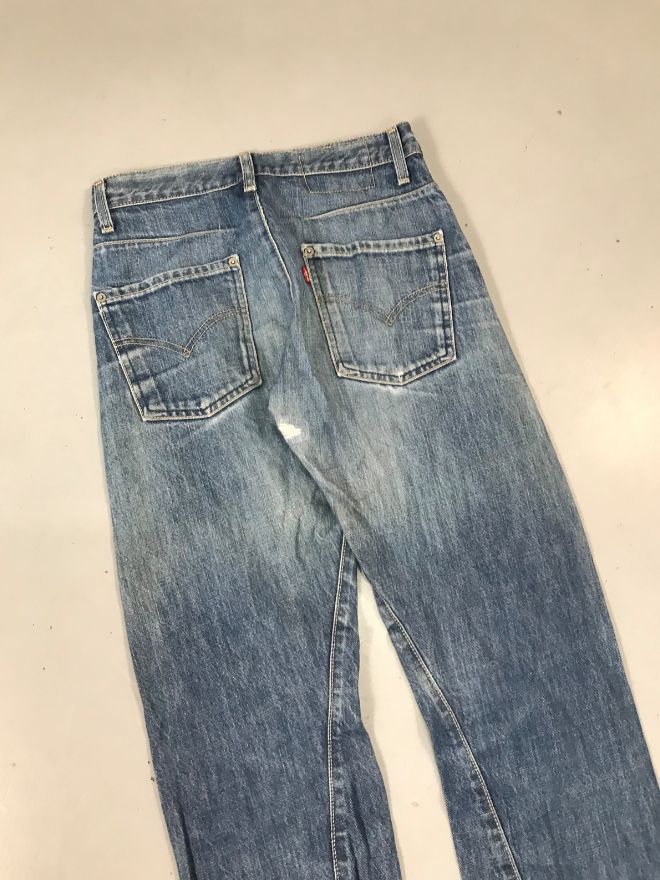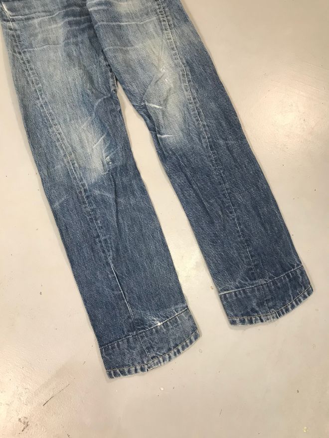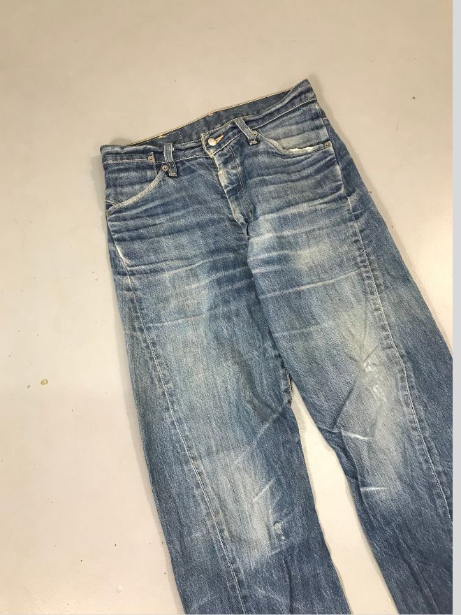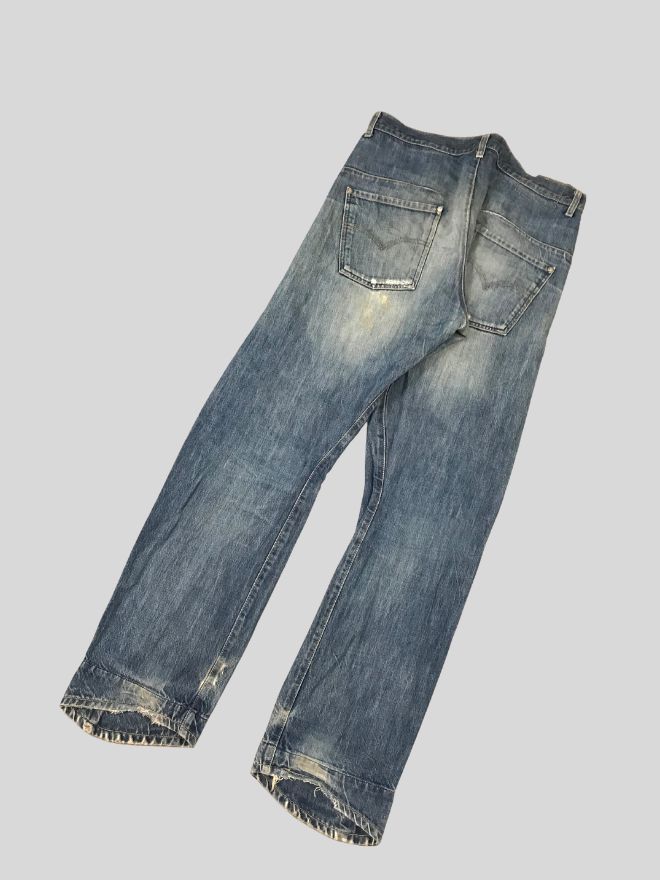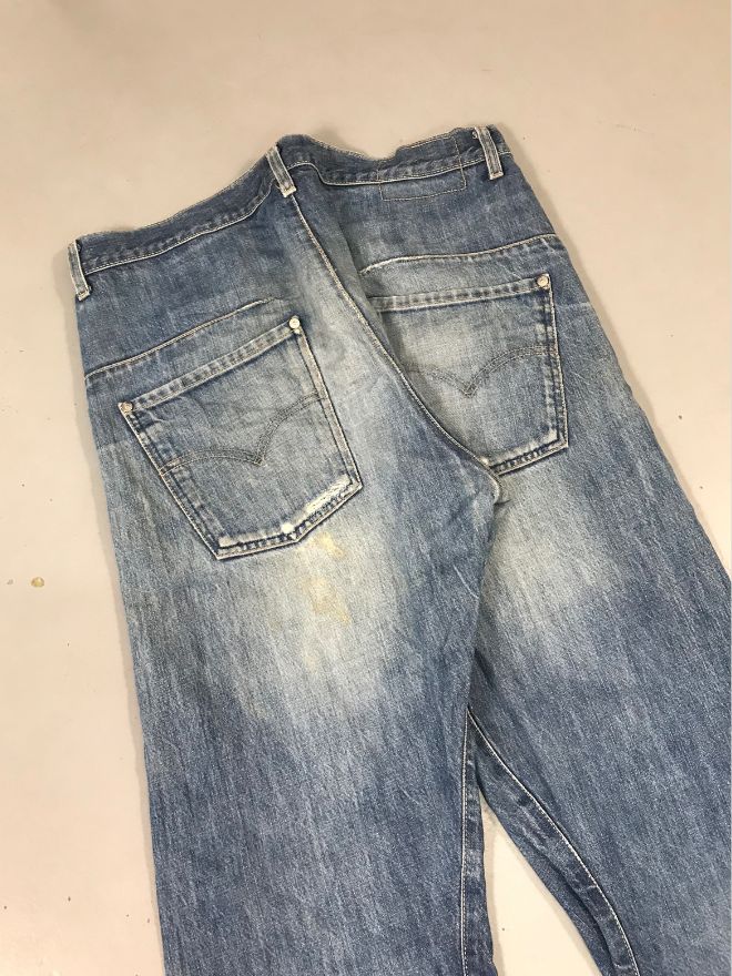 The jeans are in good wearable condition, with only light dusty stains that may require a hard wash or dry cleaning. Overall, they remain comfortable and well-shaped.