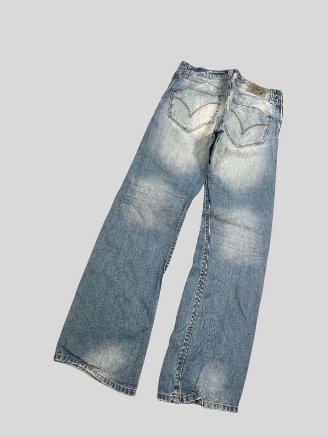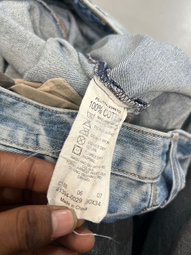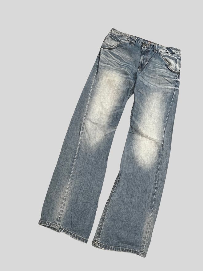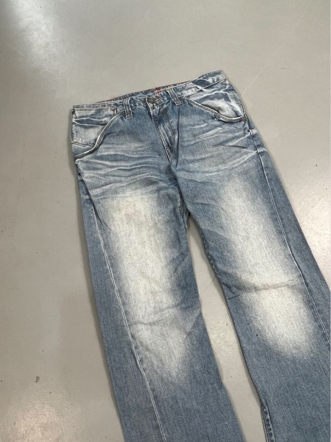 Condition-wise, this is a used vintage piece in good wearable shape. The jeans are perfectly comfortable, with some dusty stains present due to storage and age. A hard wash or professional dry cleaning is recommended before wear. Please review all images carefully to understand the exact condition and vintage character of the denim.