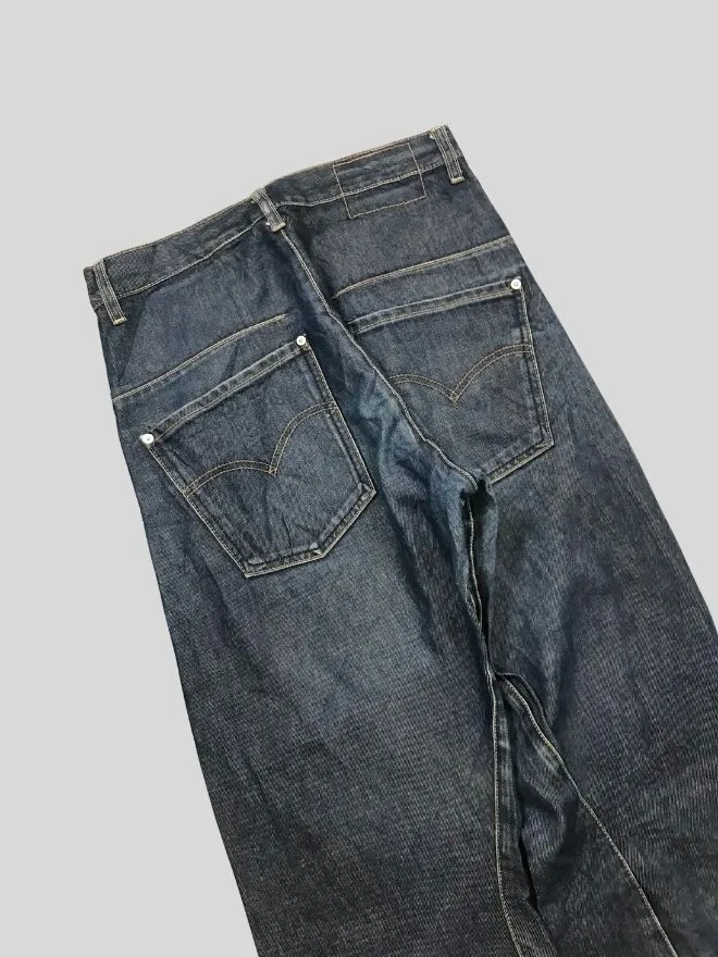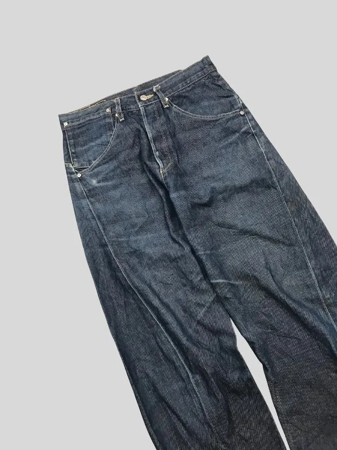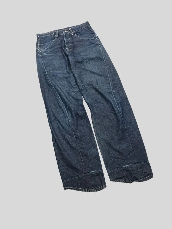 Authentic vintage Levi’s engineer jeans featuring classic workwear-inspired denim construction. These jeans showcase the timeless Levi’s look with a rugged, worn-in character that only true vintage pieces have. The blue denim has natural fading and distressing from age and use, adding to its unique appeal.