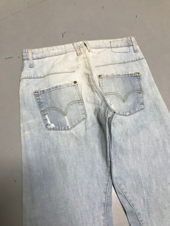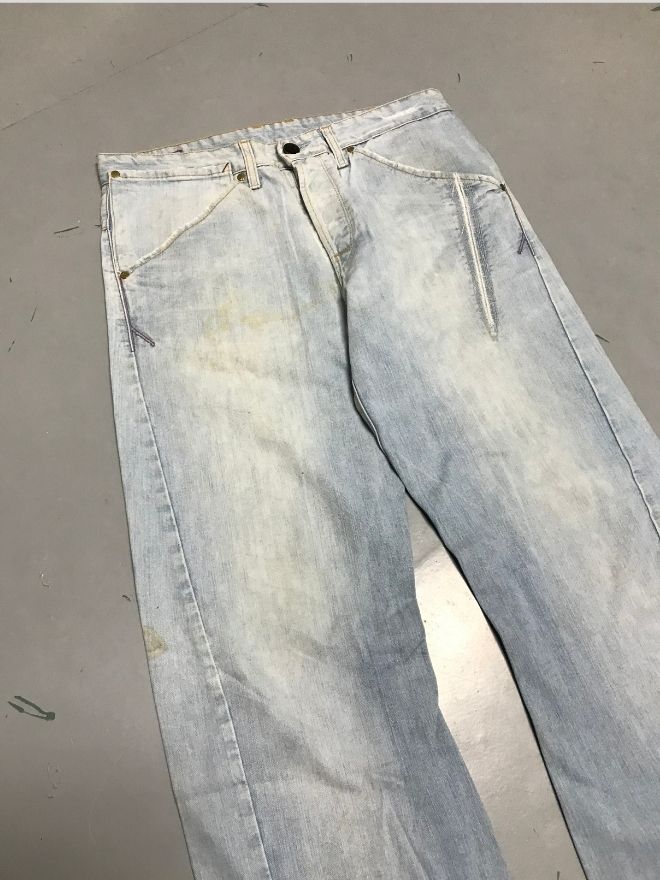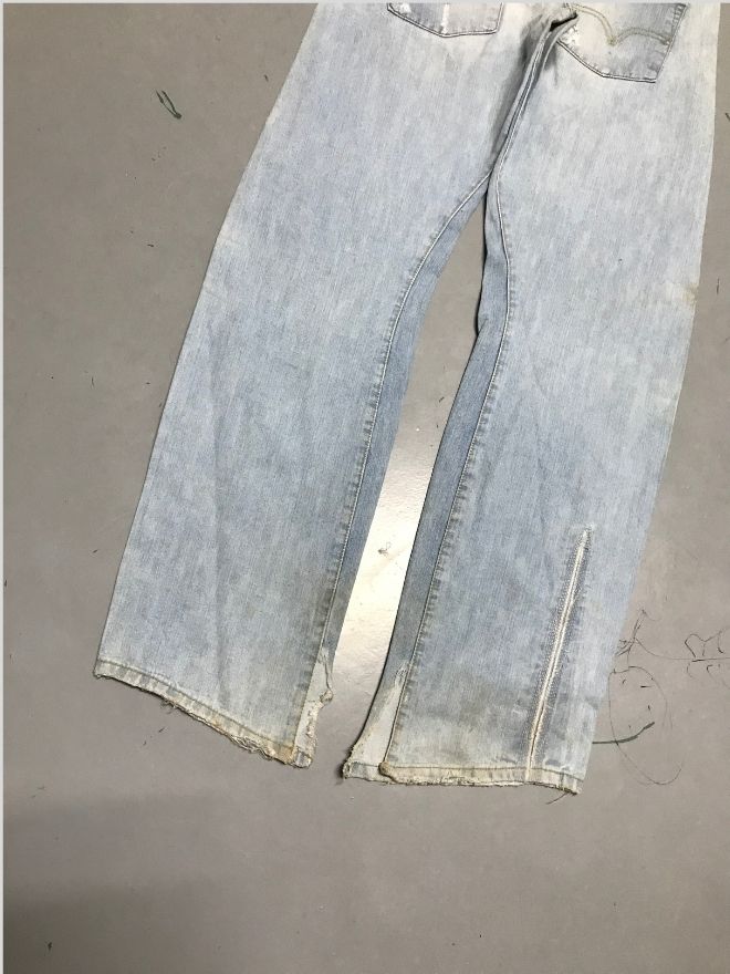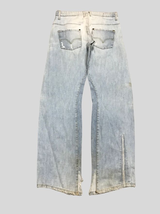 The jeans come in a classic blue denim wash with visible signs of wear, including damages that reflect their true vintage character. These details enhance the uniqueness of the piece and make each pair one of a kind. Perfect for those who appreciate authentic, worn-in denim with an avant-garde edge.