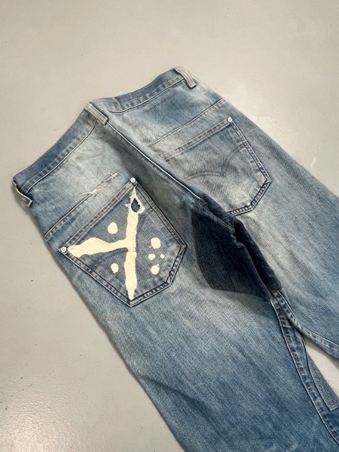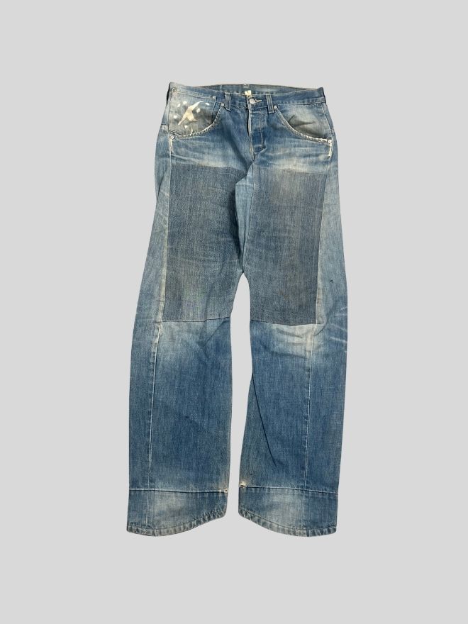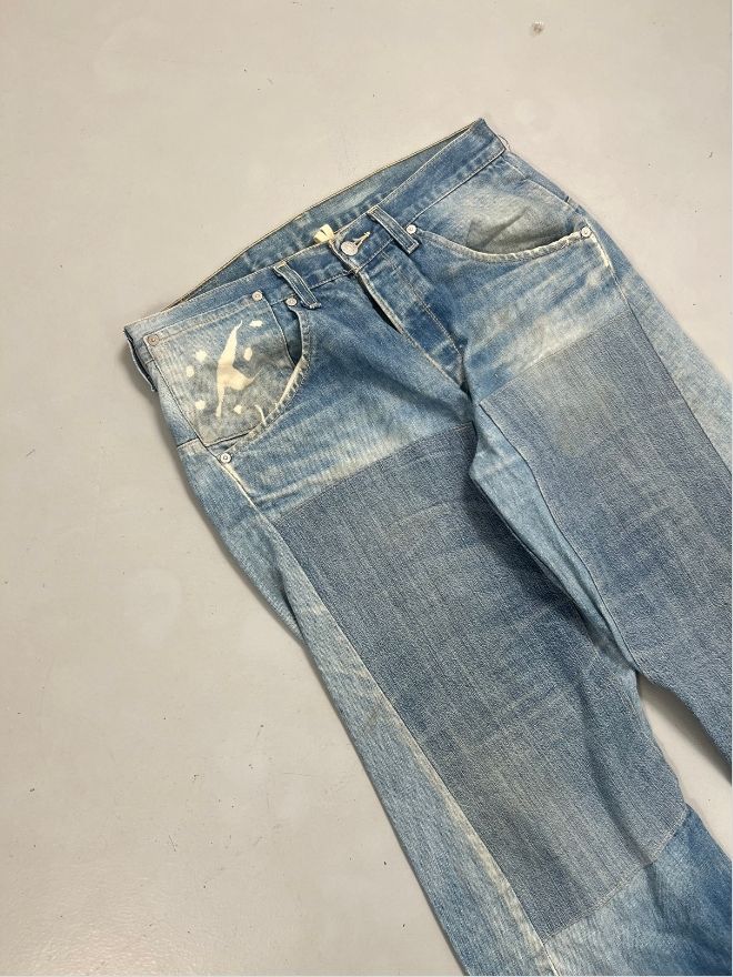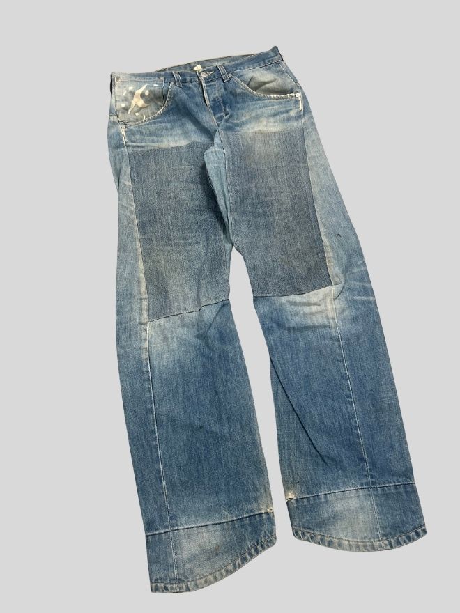 A rare pair of Vintage Levi’s Engineer Jeans featuring the iconic red tab branding and engineered seam construction. This pair includes distinctive design elements such as a shaped leg structure and wrap seam layout, offering a unique take on traditional Levi’s denim silhouette.