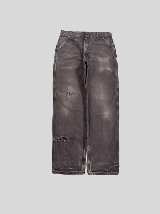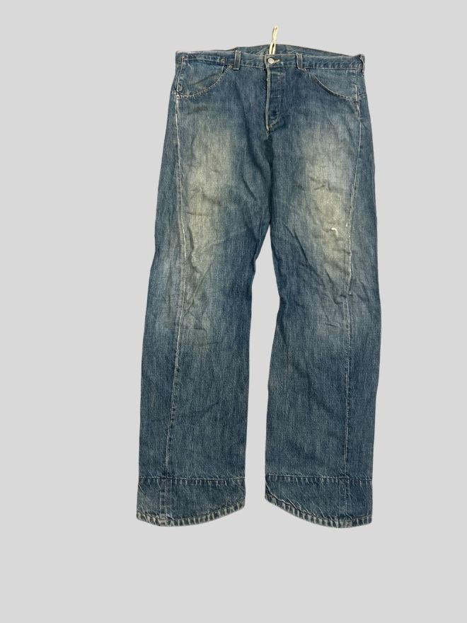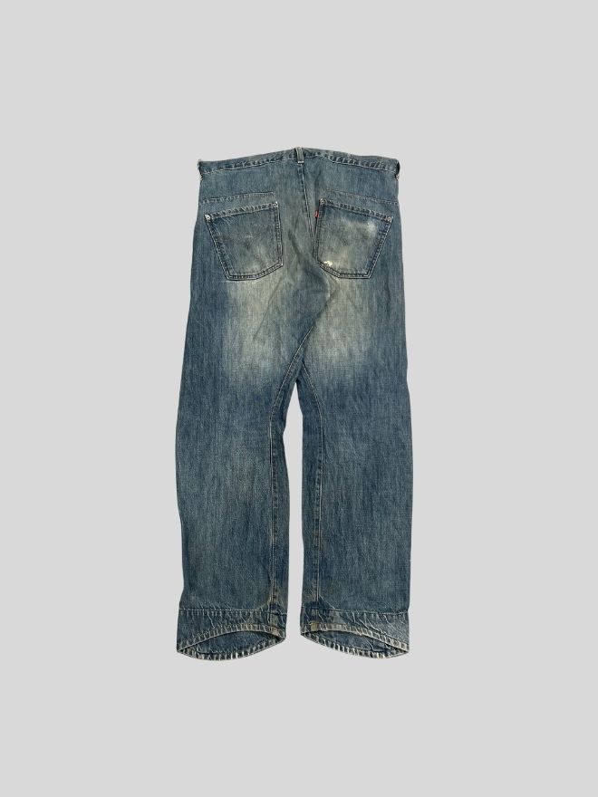 The jeans show some damages and distressing, enhancing the authentic vintage aesthetic.