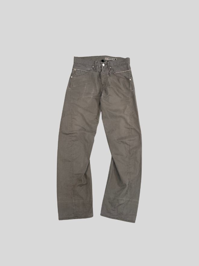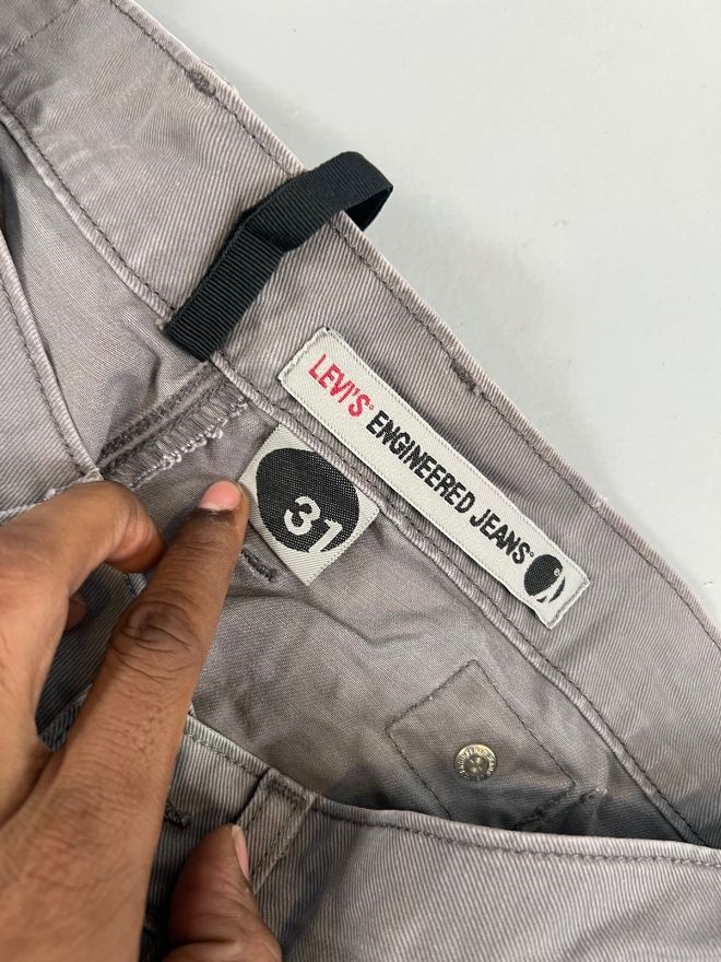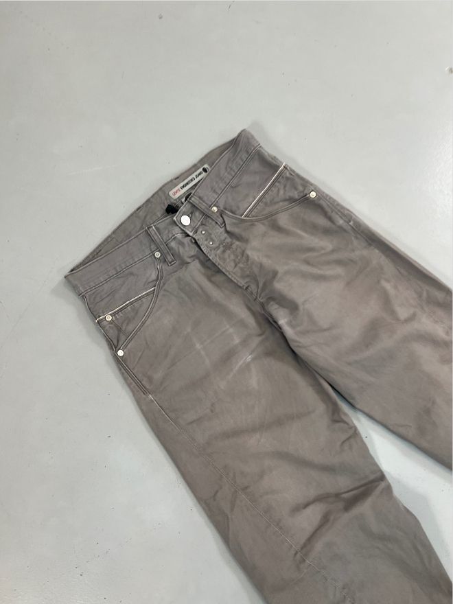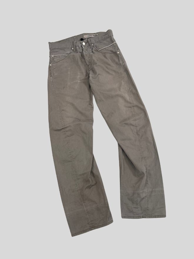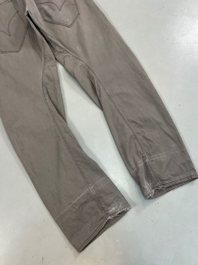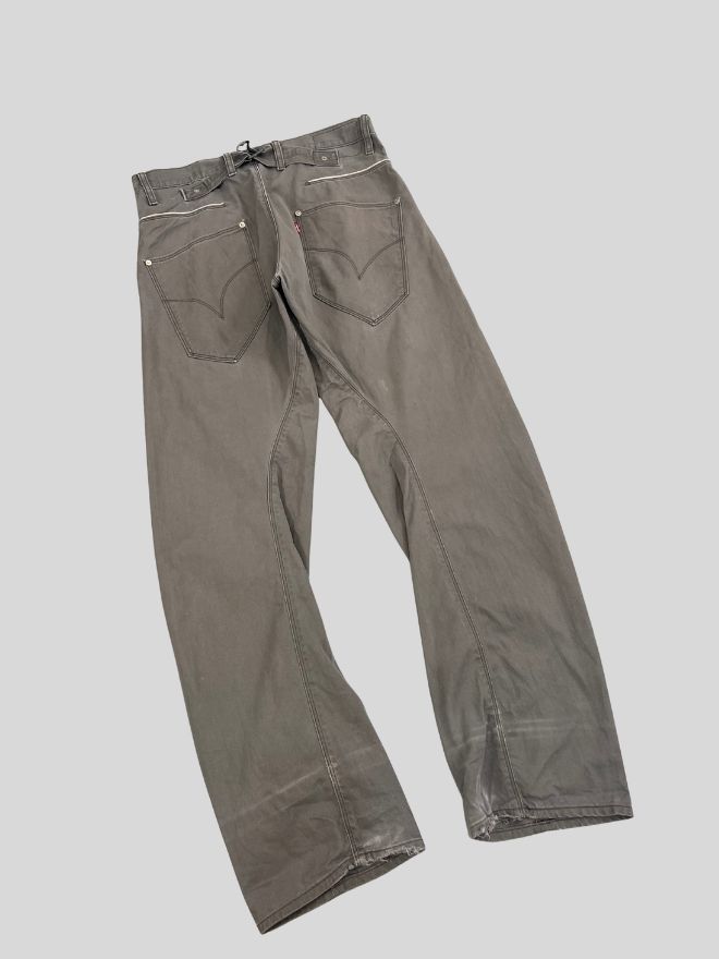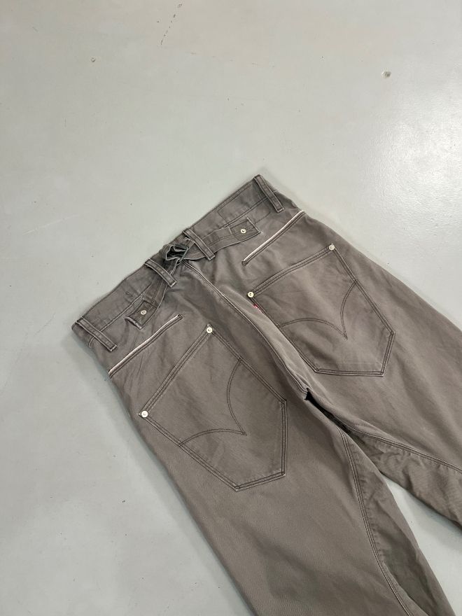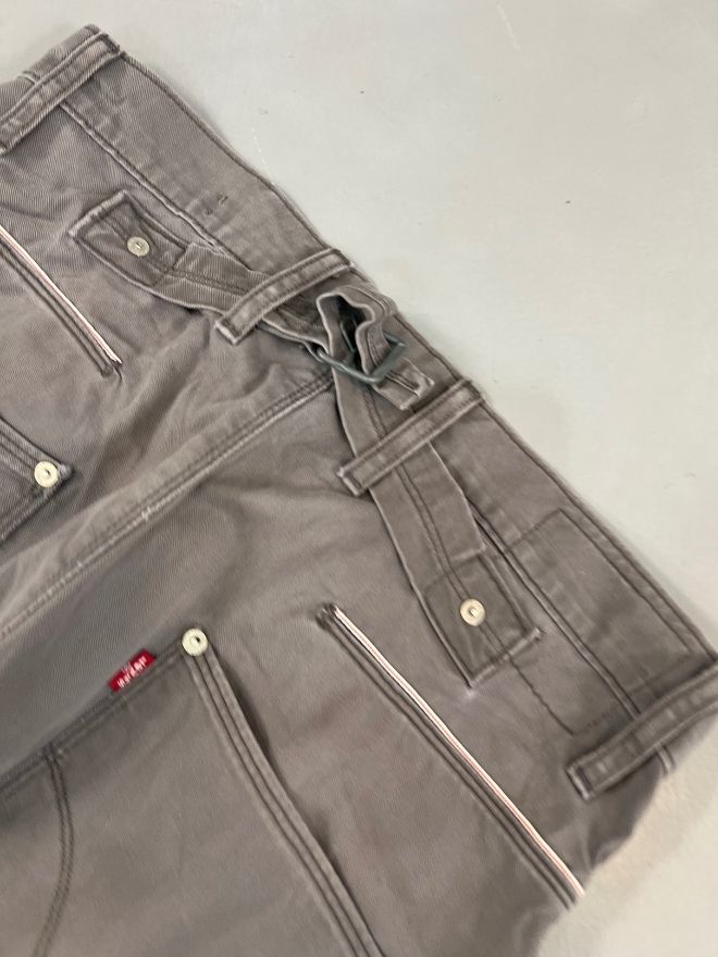 Vintage Levi’s Engineer Jeans in Men’s US 32 / EU 48. Gray denim with original buckle belt detail. Used condition with visible damage—please review photos. Rare avant-garde workwear piece with full measurements provided.