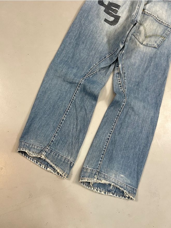Rare Vintage Levi’s Engineer Jeans featuring the signature buckle-back adjustment strap. Tagged Size 32, iconic blue wash with authentic aging. Visible distressing and damage present — review images before purchase.