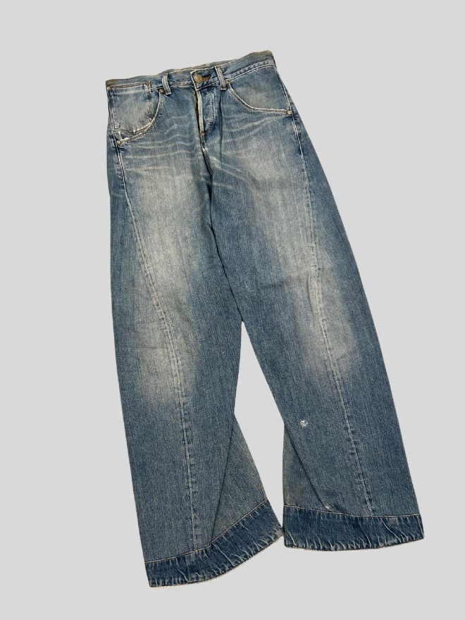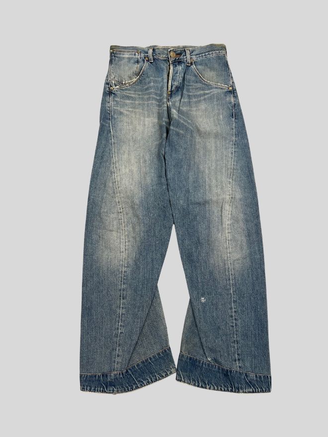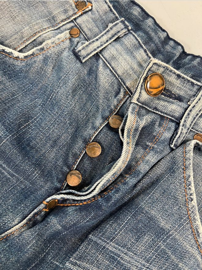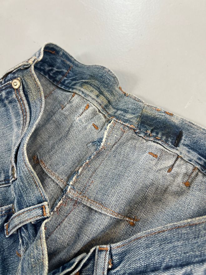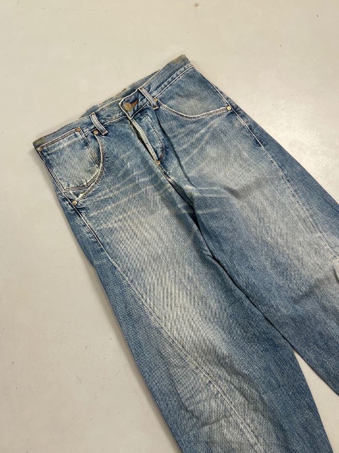 Sized 30, these jeans come in a faded blue tone with a straight engineered leg. The denim is comfortable and well-maintained with minor dusty marks from storage and age, which may improve with dry cleaning. The wear and patina give it a true vintage look that collectors and enthusiasts appreciate.