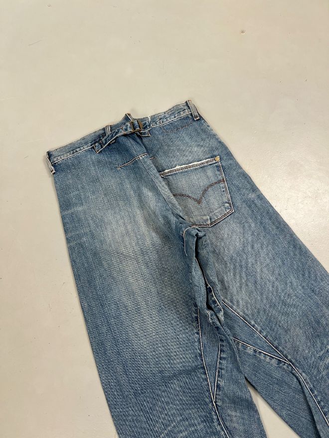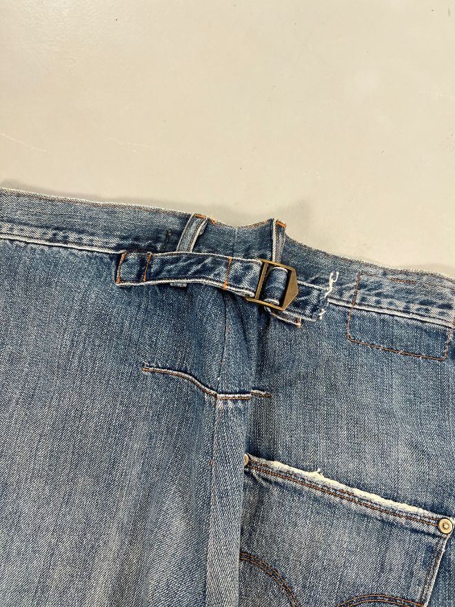 Vintage Levi’s engineer denim featuring the iconic built-in waist buckle. Size 30. Classic faded blue wash, great structure, and authentic vintage character. Some dusty wear from age — overall well-kept and comfortable.