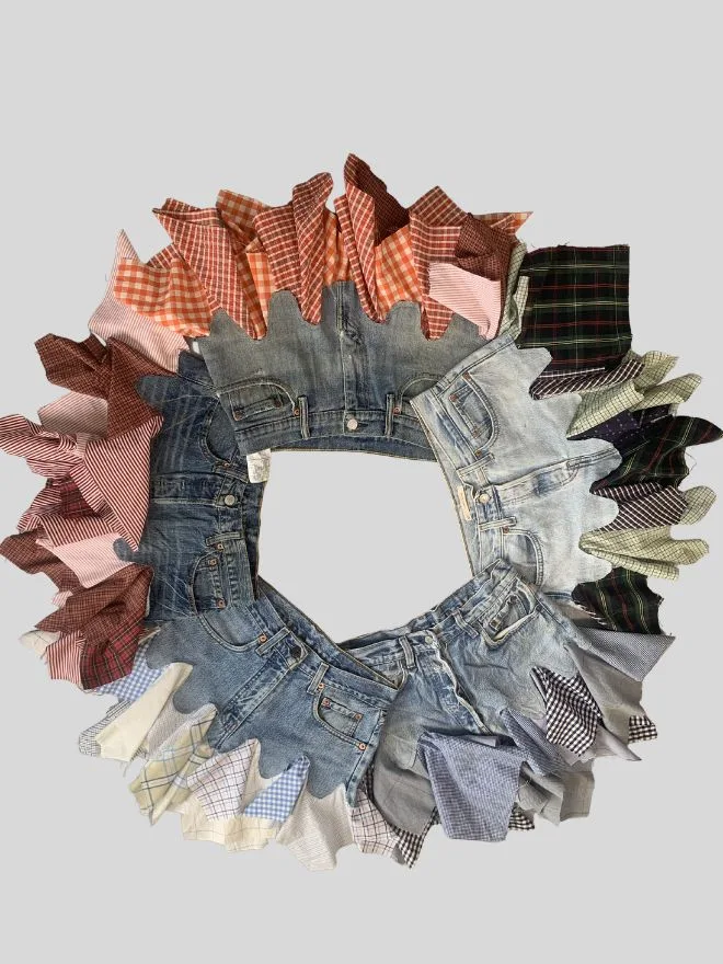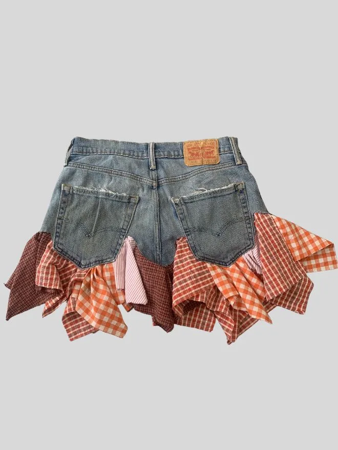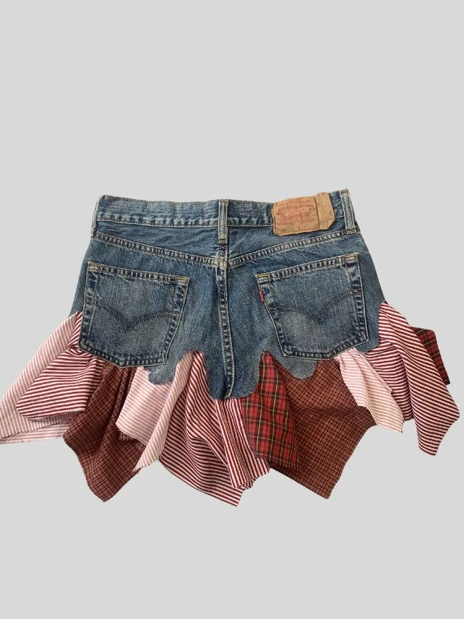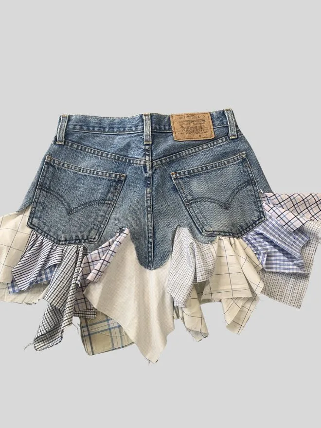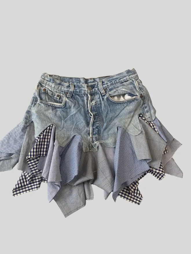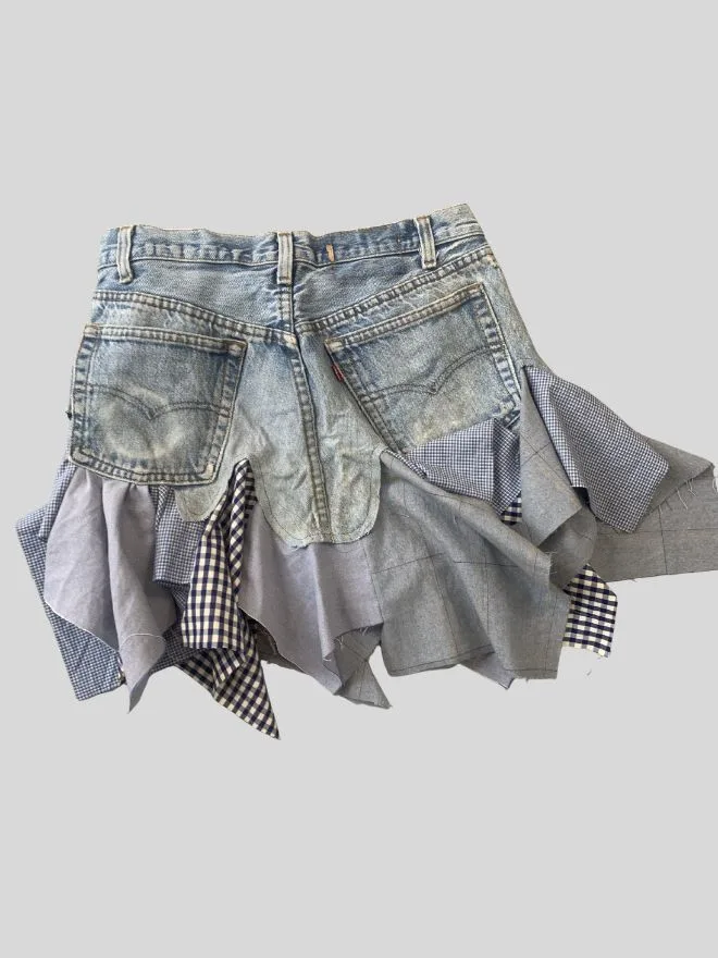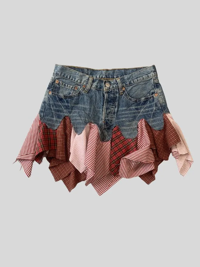 A unique reworked skirt crafted from vintage Levi’s denim and vintage cotton shirts, featuring artistic patchwork detailing for a bold and sustainable fashion statement.