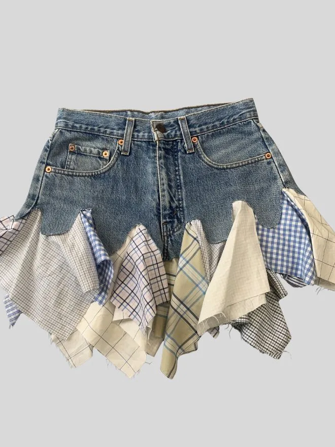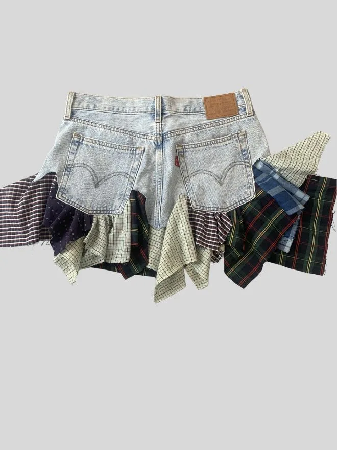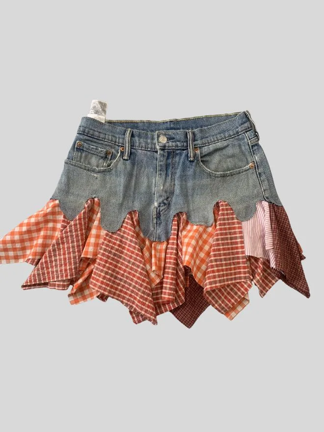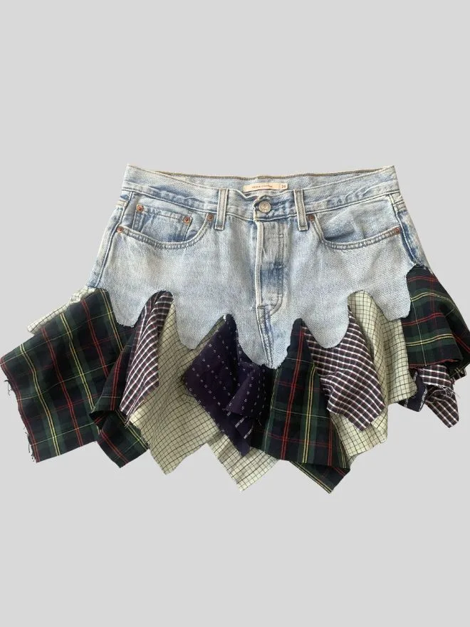 Each piece highlights unique patterns, checks, and stripes sourced from vintage shirts, making every skirt slightly different and truly special. The design blends rugged denim with soft cotton fabrics, resulting in a playful and artistic garment that stands out effortlessly.