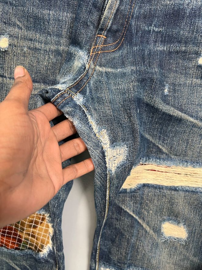 Condition: Used. There are some damages that have been repaired. The repairs are visible and are part of the vintage nature of the jeans.