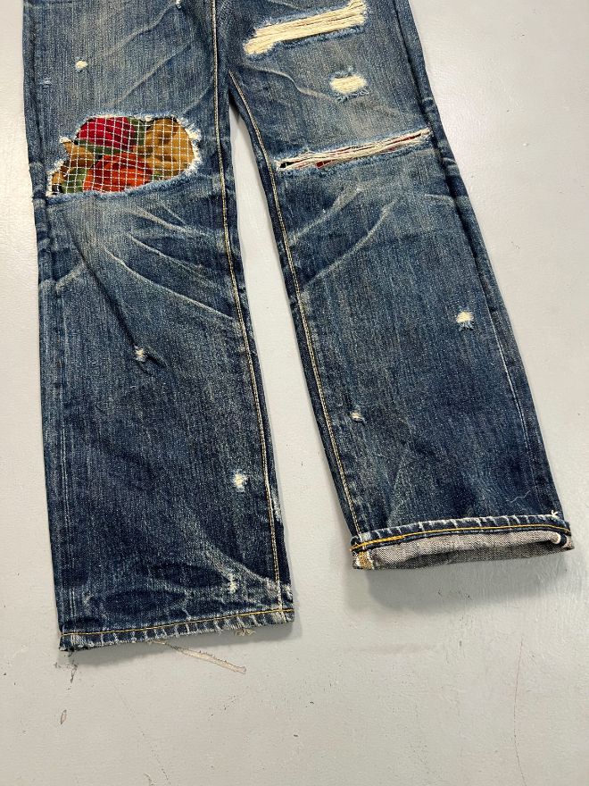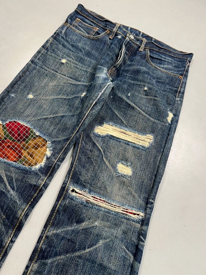 Finished in a classic blue denim wash, this pair shows authentic vintage character developed over time. The jeans feature repaired damage, which maintains the integrity of the denim while adding to its unique, worn-in look. Please review all images carefully to fully understand the condition before purchasing.