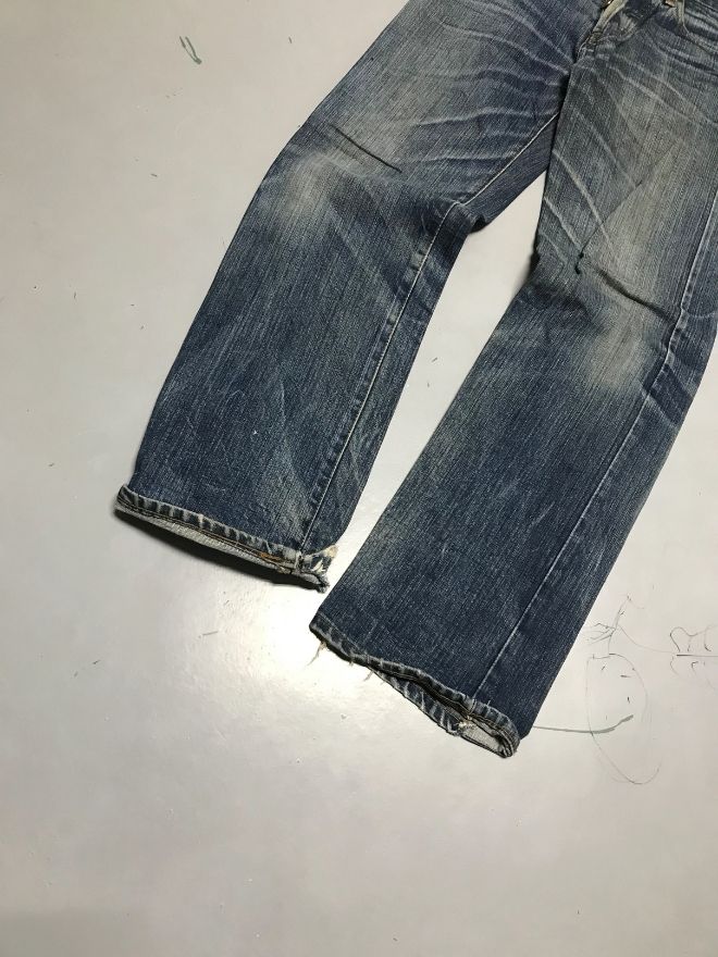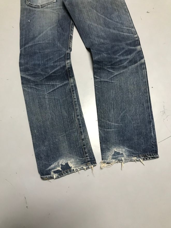 This pair features a classic blue denim wash with authentic wear throughout. There are some damages that have been repaired, preserving both the structure and character of the jeans while maintaining comfort and wearability. The repairs add to the vintage story of the garment and enhance its individuality.