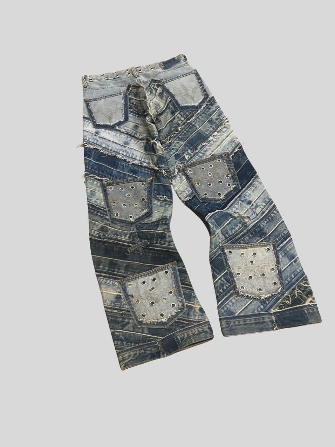 The jeans come in a blue vintage wash with a relaxed, wearable fit. The upcycled patchwork adds strong visual character, making these jeans ideal for those who appreciate sustainable fashion, creative denim, and statement pieces. Perfect for styling with simple tees, hoodies, or layered streetwear looks.