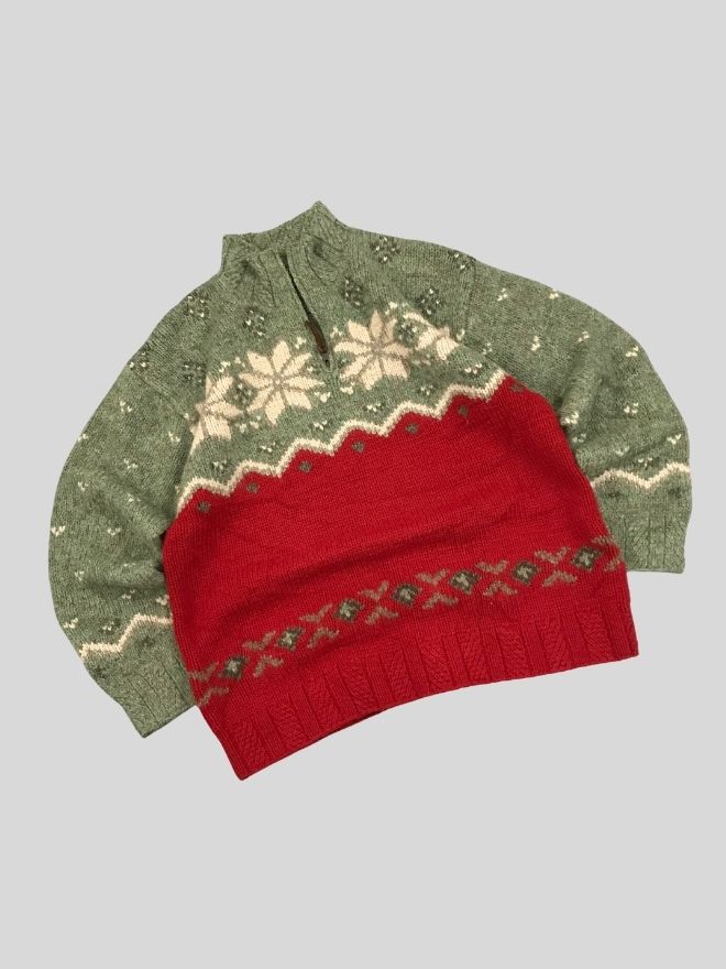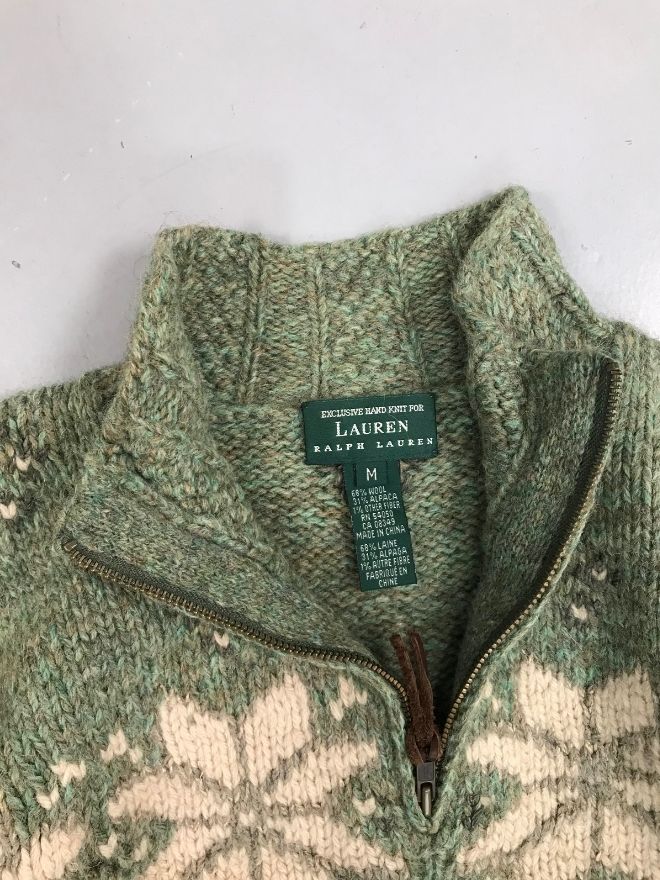 Authentic Vintage Polo Ralph Lauren knit sweater featuring a 1/4 zip design, multi-tone knit pattern, and premium soft fabric. Tagged Size L, fits like men’s S–M depending on preference. In good used condition, just requires a fresh dry clean.