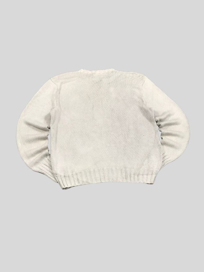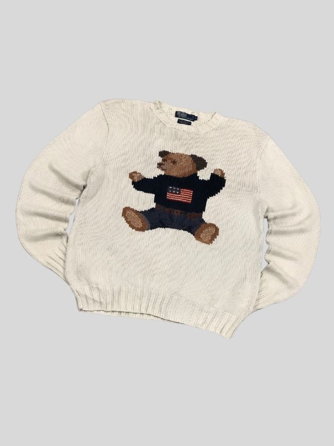 Iconic Vintage Polo Ralph Lauren Bear Sweater in white. Classic collectible knit with embroidered bear graphic — a rare and highly sought-after piece. Tagged Size M, fits like US Small–Medium depending on preference. Well-maintained condition.