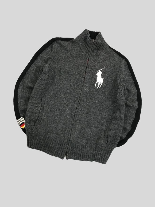 Vintage Polo Ralph Lauren Big Pony Zip Sweater with Germany flag detailing. Classic black knit with signature oversized polo logo. Tagged M, fits closer to XXS–XS slim, depending on style. Well maintained and ready to wear.