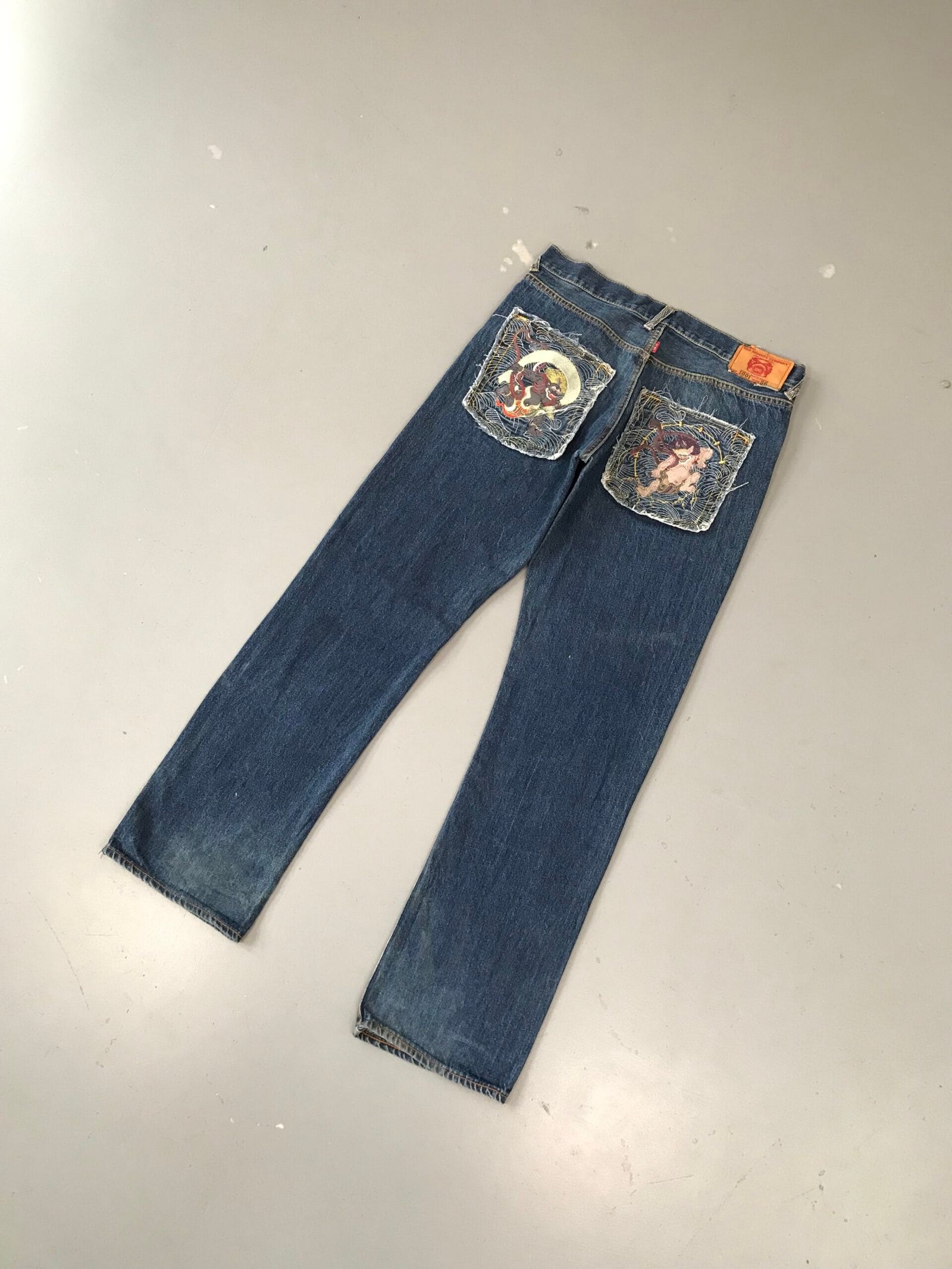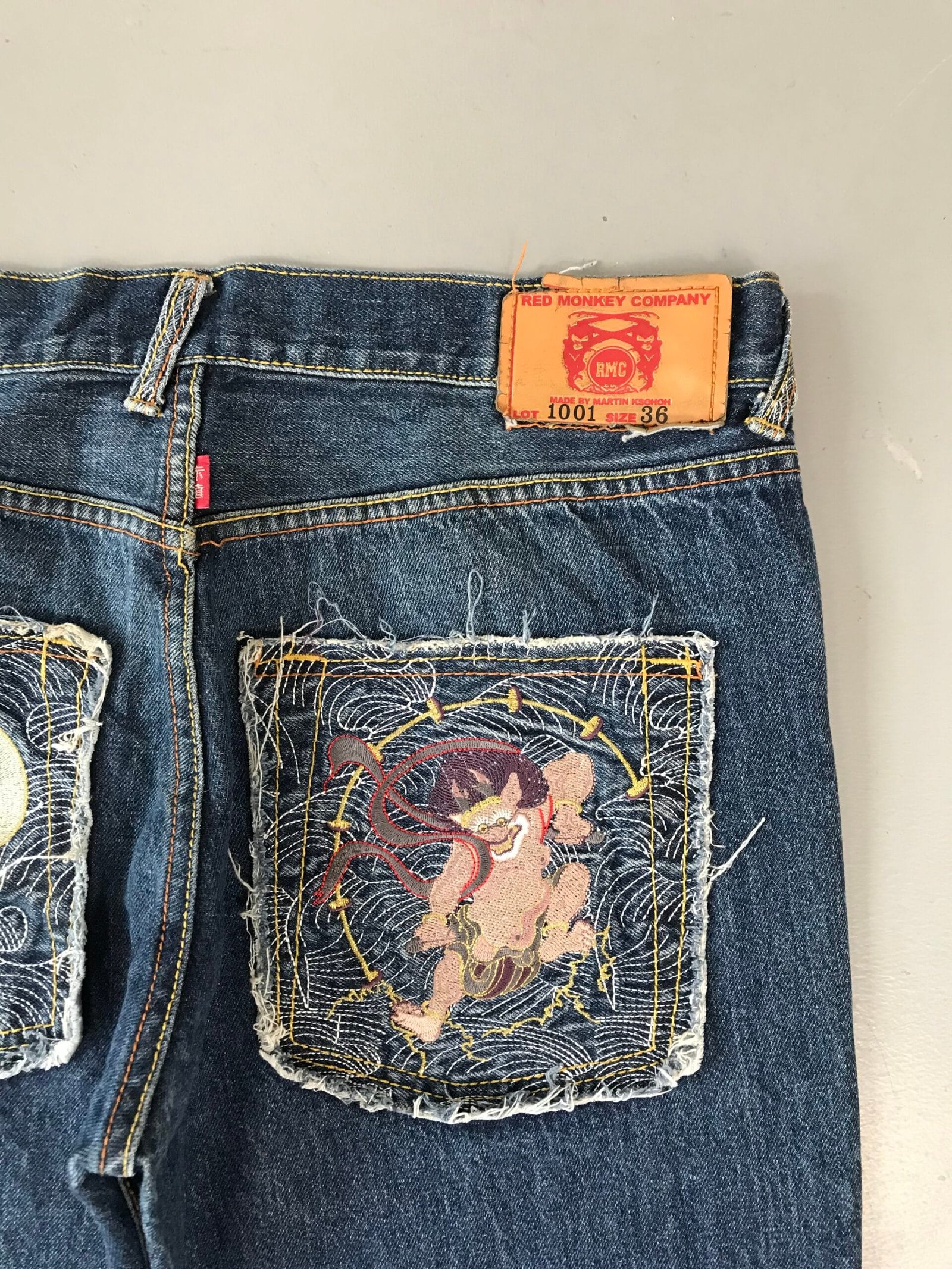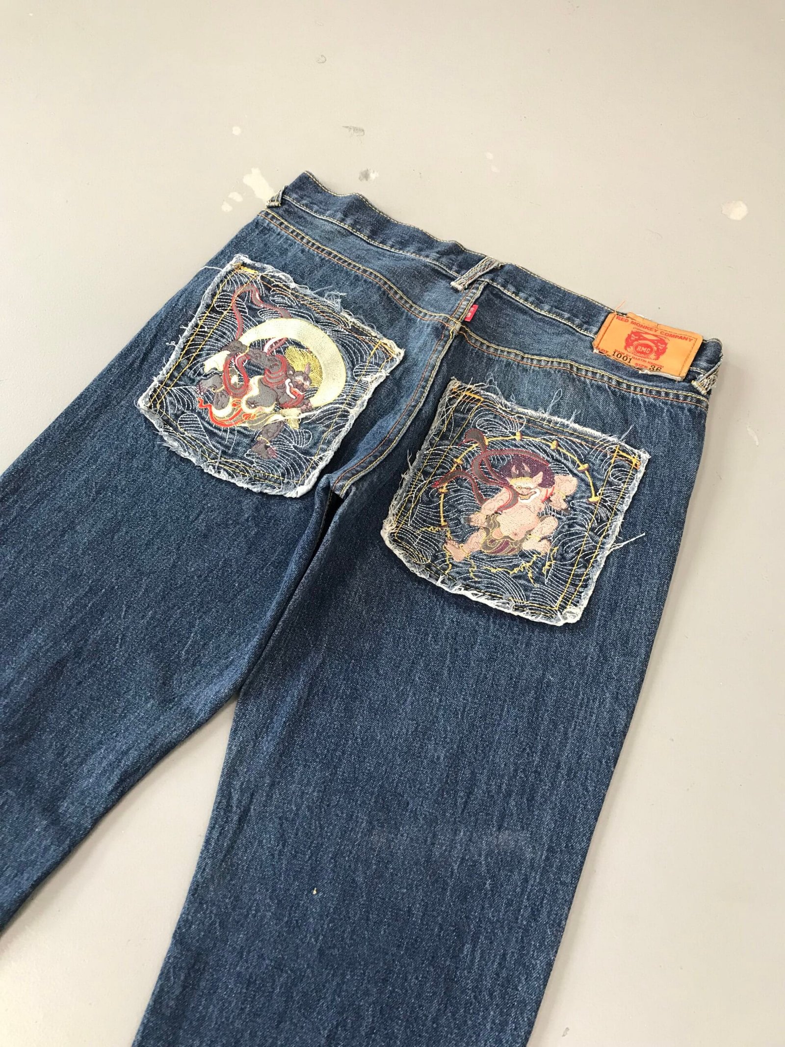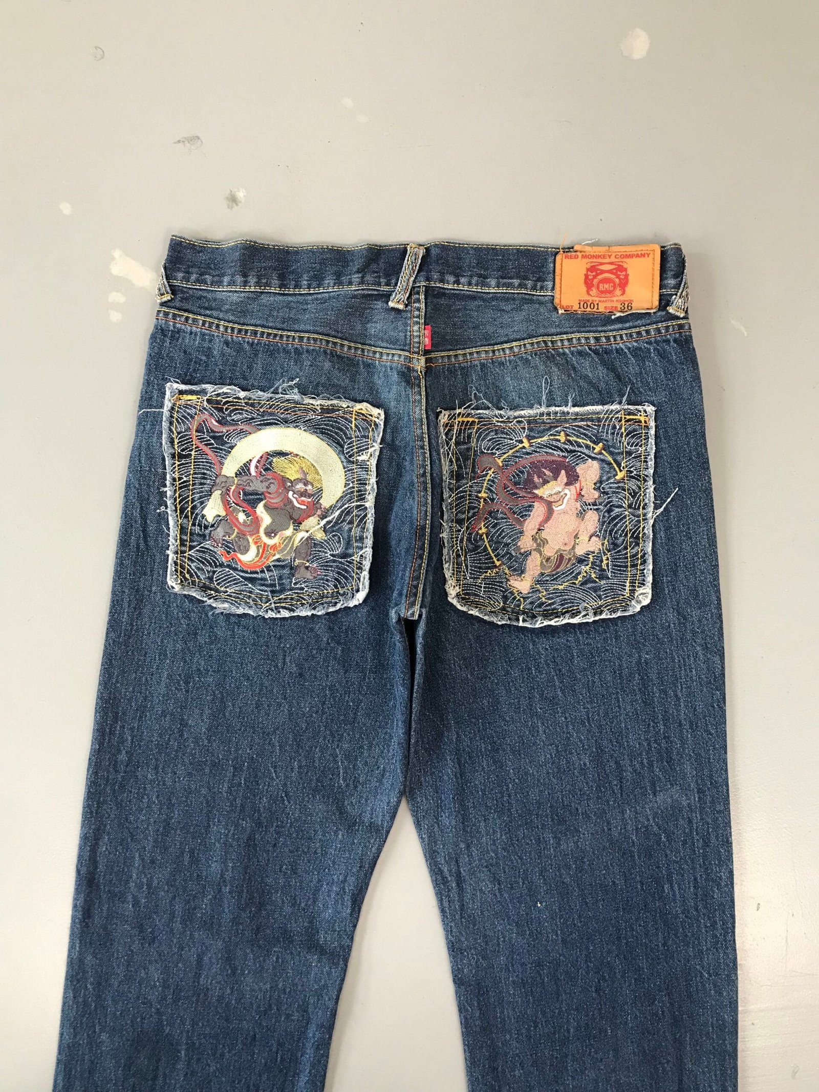 VINTAGE RMC JAPANESE SUKAJAN RAIJIN & FUJIN GOD EMBROIDERED DENIM