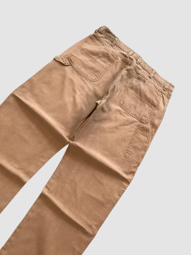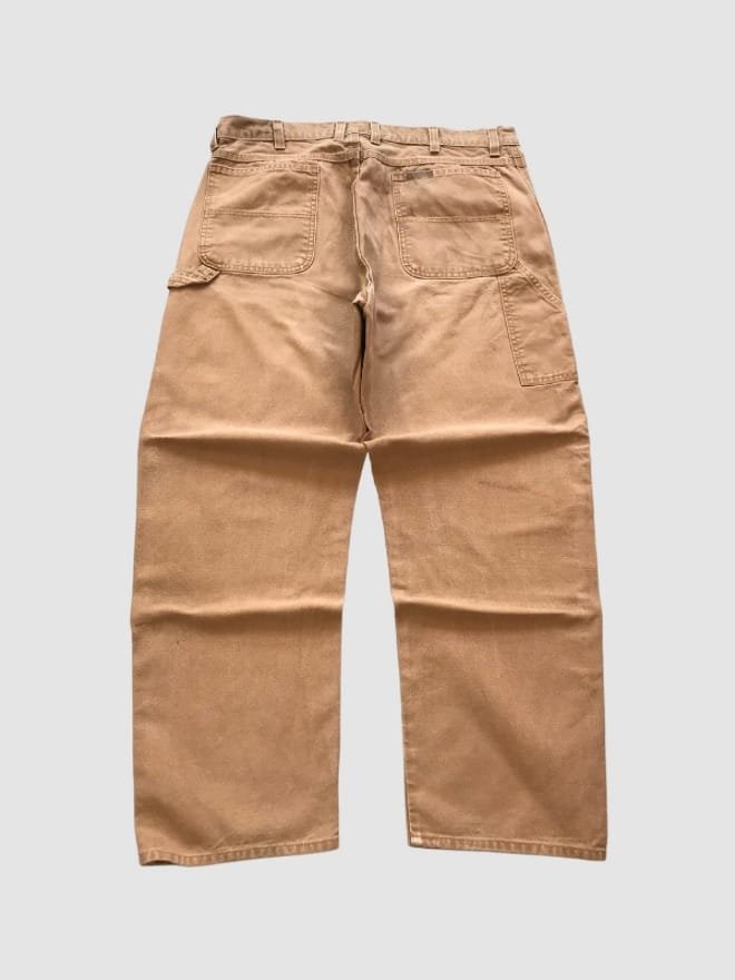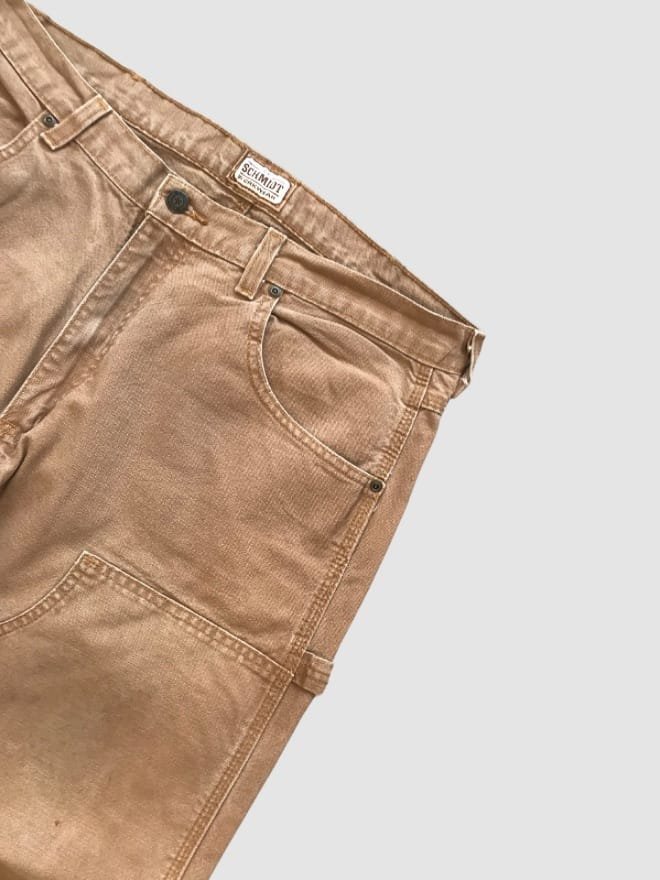 Vintage Schmidt Double Knee Denim – Legendary Durability, Classic Style. This pair of vintage Schmidt double knee carpenter jeans embodies the brand’s reputation for rugged construction and timeless design. Featuring the iconic double knee reinforcement, these jeans are ready for anything from tough jobs to everyday wear. [Mention any specific details like the wash, any unique wear or distressing, any specific Schmidt details,