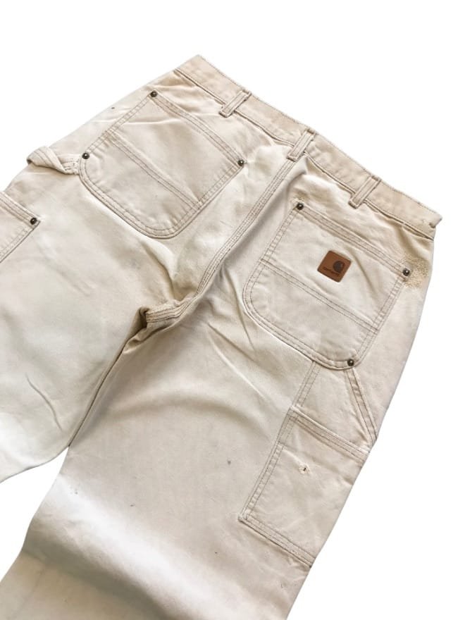 Embrace the worn-in character of these vintage Carhartt B136 BRN Double Knee Carpenter Denim jeans. This pair showcases the authentic look of workwear that has seen its share of sun and wear, resulting in a unique, faded brown hue.