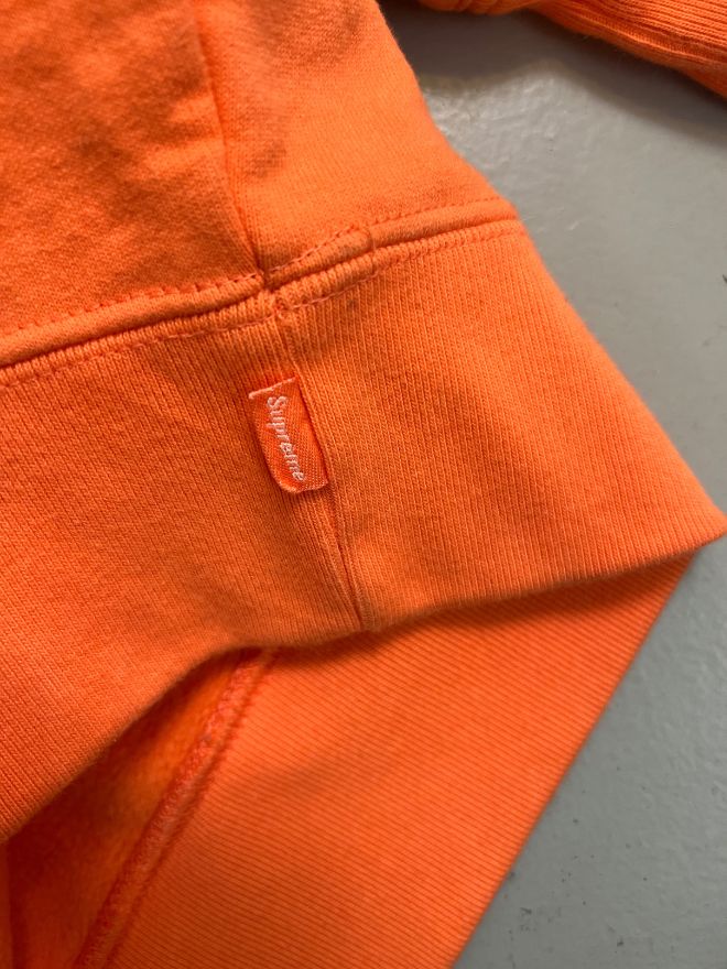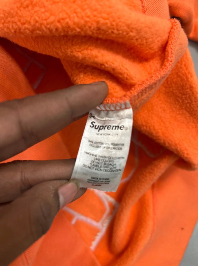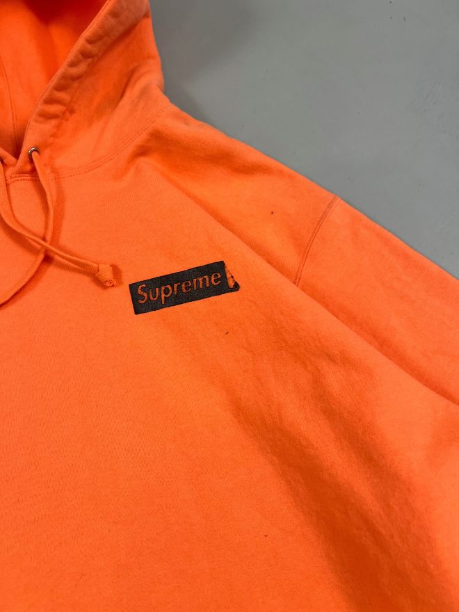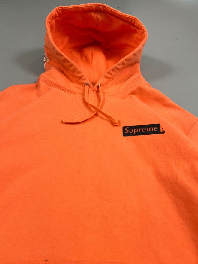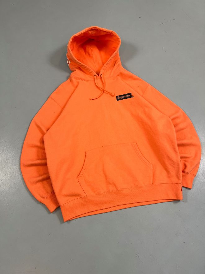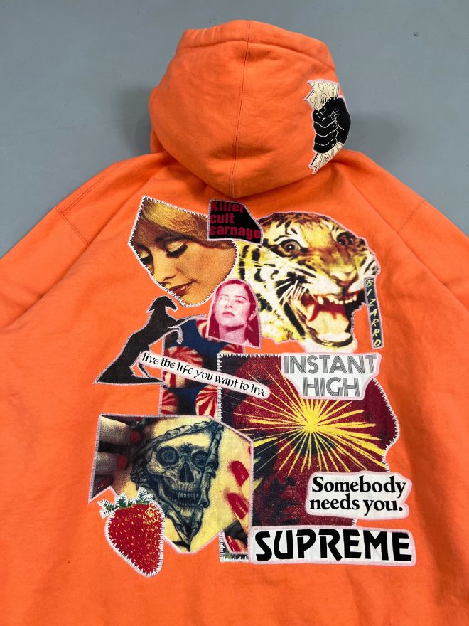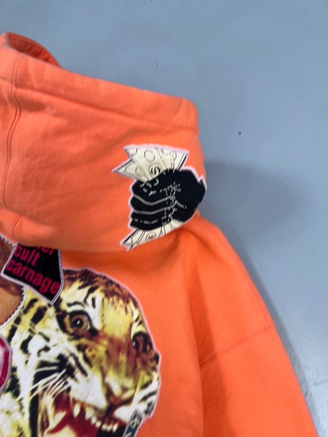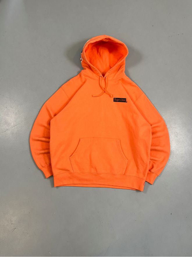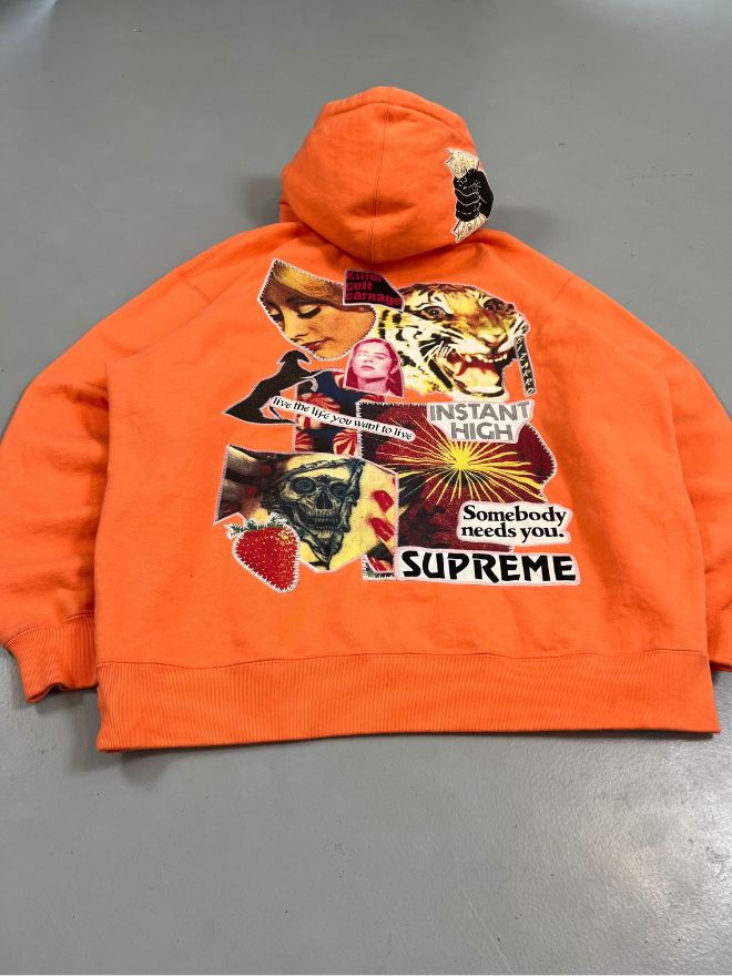 A rare vintage Supreme-inspired patchwork hoodie featuring a bold baggy fit, oversized streetwear silhouette, and vibrant orange color. Size L with unique multi-patch detailing, soft interior, and well-kept condition. Perfect for collectors and streetwear lovers looking for a one-of-a-kind vintage statement piece.