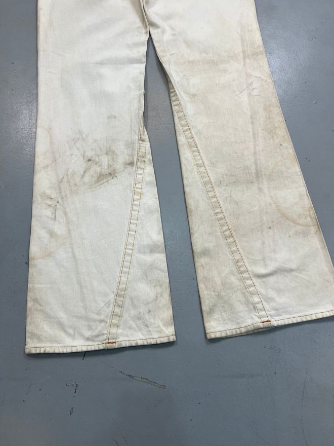 The denim has a structured yet wearable feel, offering a straight-to-relaxed silhouette with a wide leg opening that complements vintage and avant-garde styling. The white base color allows the embroidery to pop, giving the jeans a unique and eye-catching look.