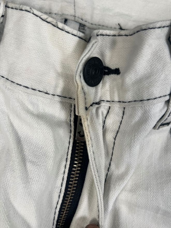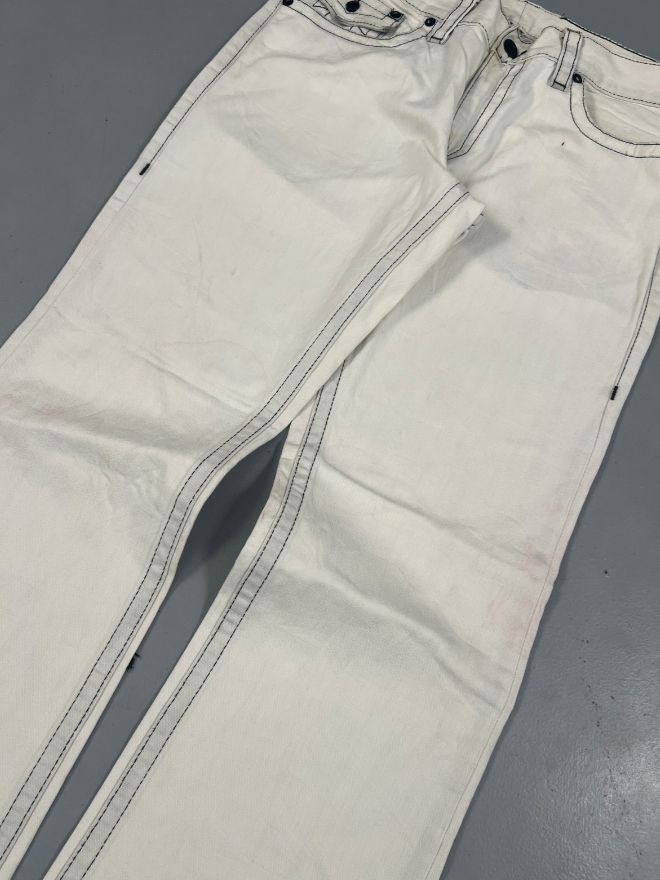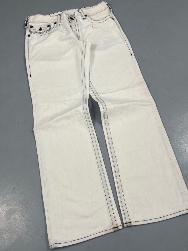 This is a vintage True Religion Joey Super T bootcut denim, one of the most iconic models from True Religion’s early era. Comes in a clean classic blue wash with thick Super T contrast stitching, flap back pockets, and the signature horseshoe embroidery — a must-have for collectors and Y2K streetwear lovers.