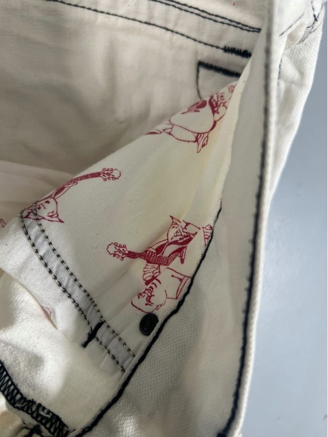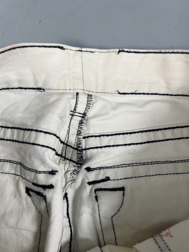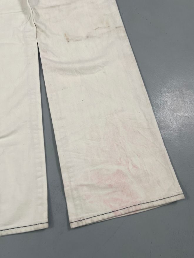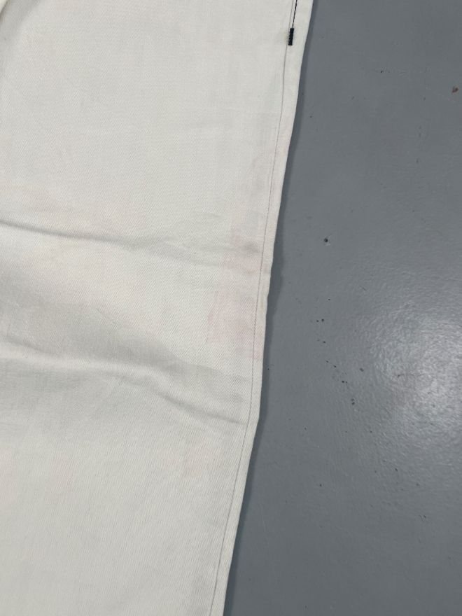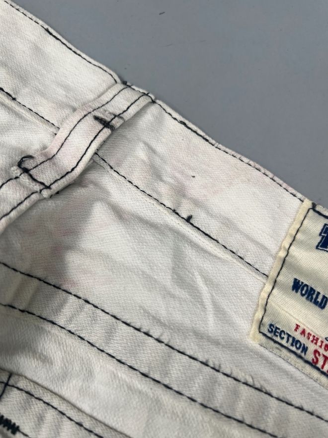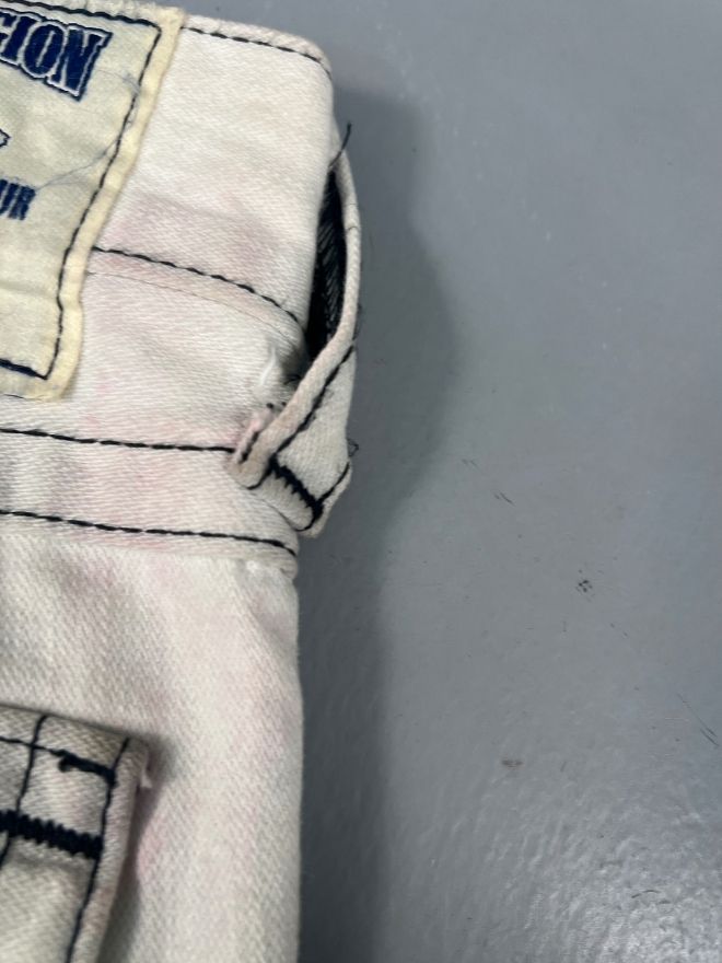 The denim has natural distressing and minor damage, which adds authentic vintage character without affecting durability. The fabric remains strong, comfortable, and well-shaped.