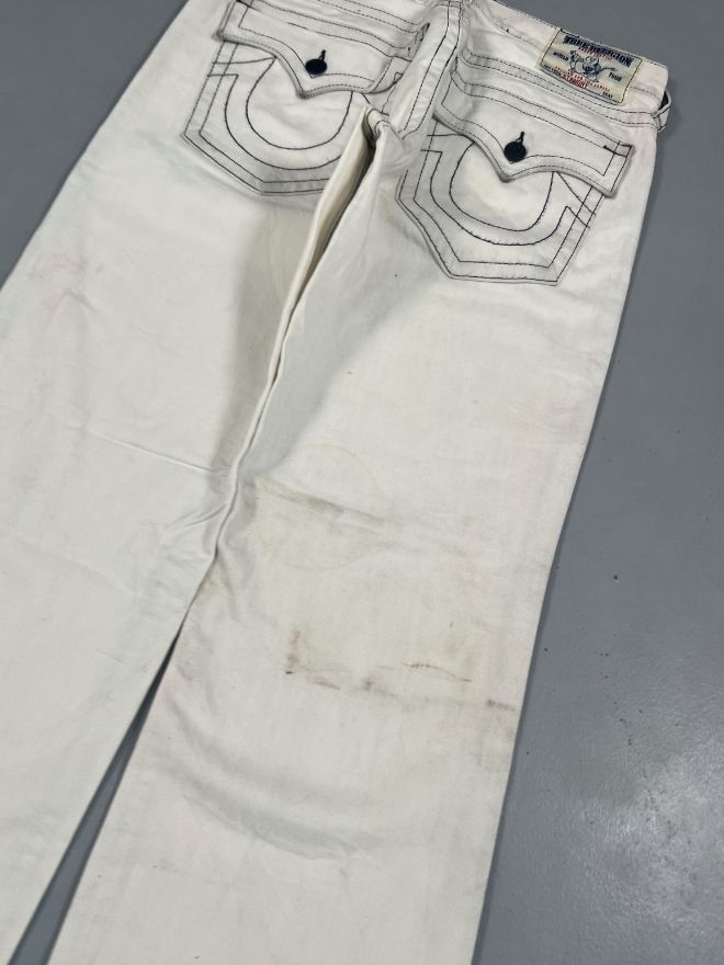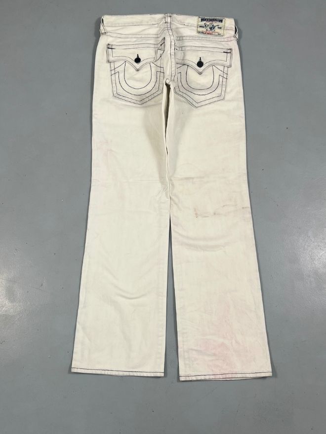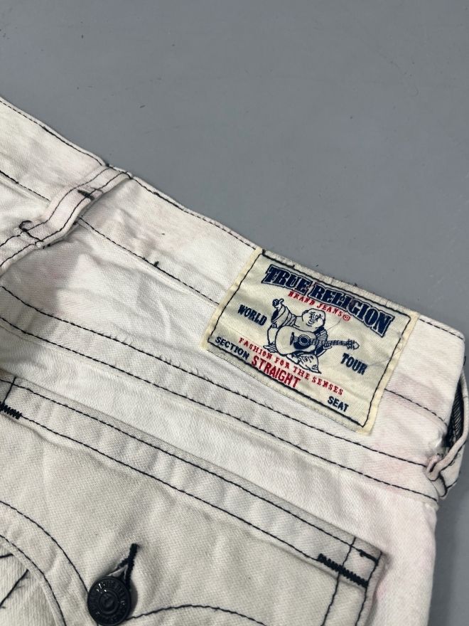 Vintage True Religion Joey Super T bootcut denim in size 35. Features signature heavy contrast stitching, horseshoe back pockets, and natural vintage distressing. Strong denim, no major defects. All measurements included below.