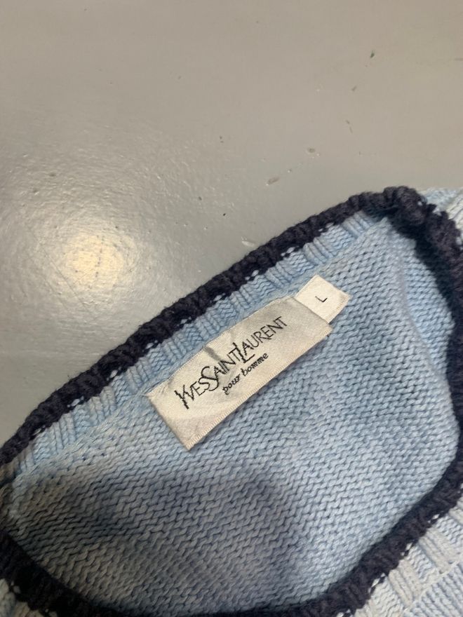 Crafted in a rich blue tone, this sweater features a clean, classic silhouette with a comfortable relaxed fit. The “White Tag” label represents vintage YSL production, making it a desirable piece for collectors and fans of heritage designer fashion.