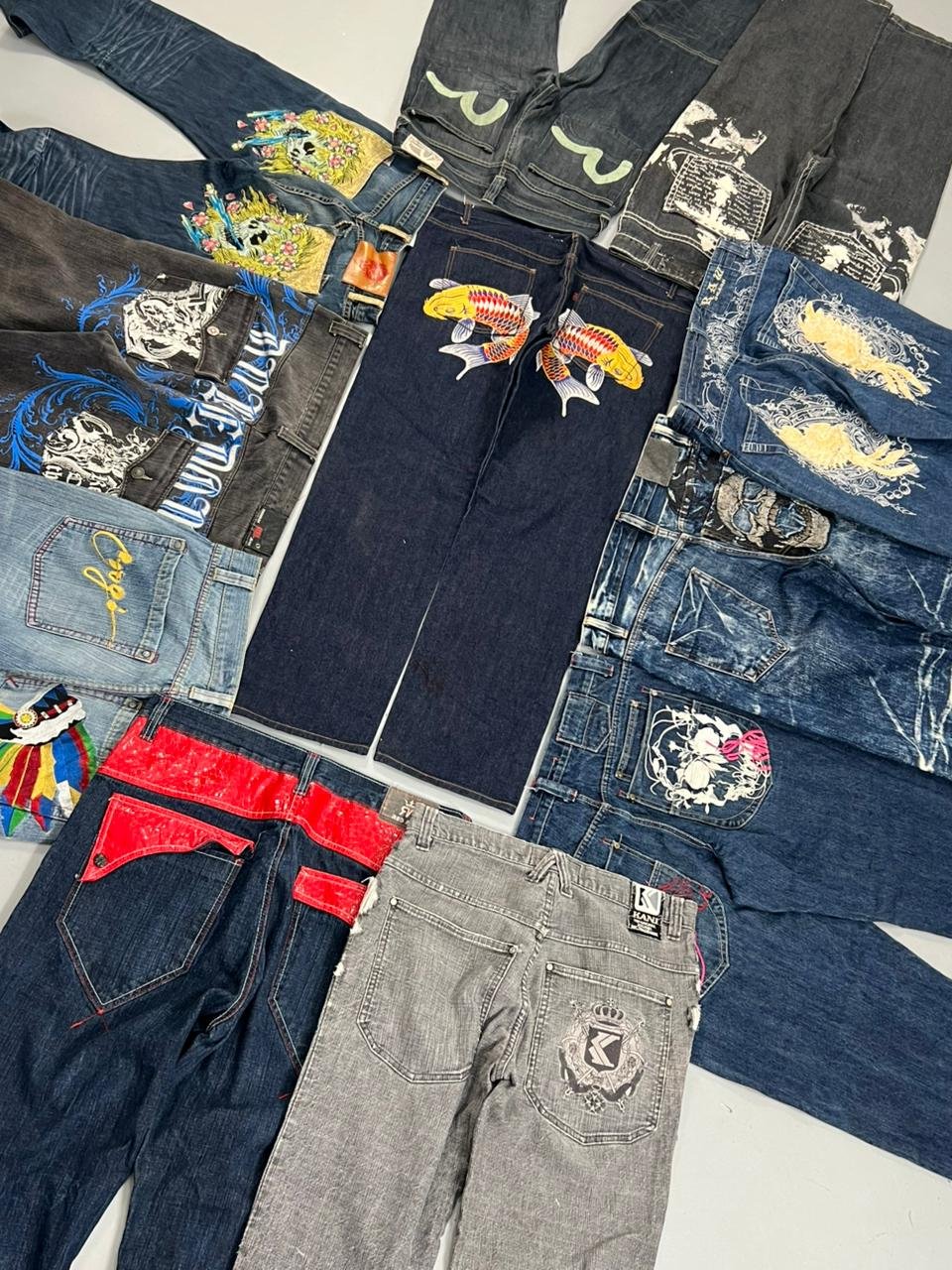 Our Embroidered Y2K Hip Hop Jeans bale includes a mix of jeans from the 80’s 90’s & 2000’s in different colours & sizes. Some bales can include rare items from designer brands such as Coogi, Ed Hardy, Fubu, Japanese, affliction, redape, sourhpole.