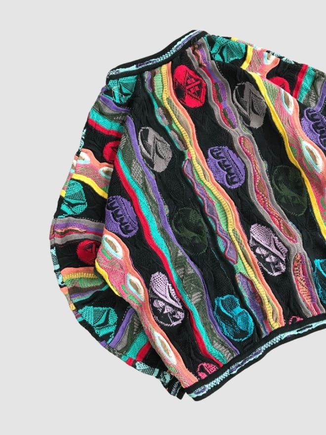 Iconic 3D Knit Pattern: The sweater features the signature Coogi 3D knit pattern, known for its intricate and vibrant design. This technique creates a textured and visually striking effect, with the yarn forming raised patterns and intricate motifs.